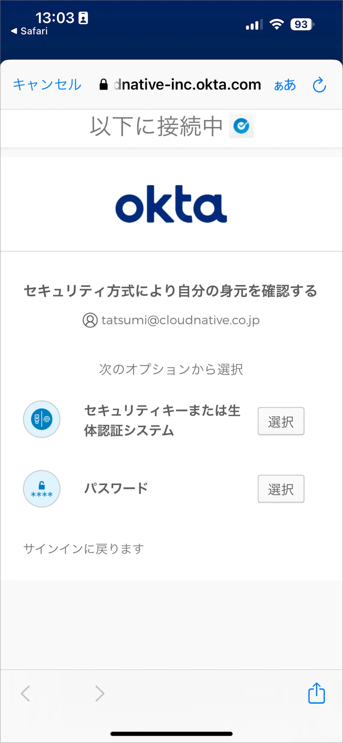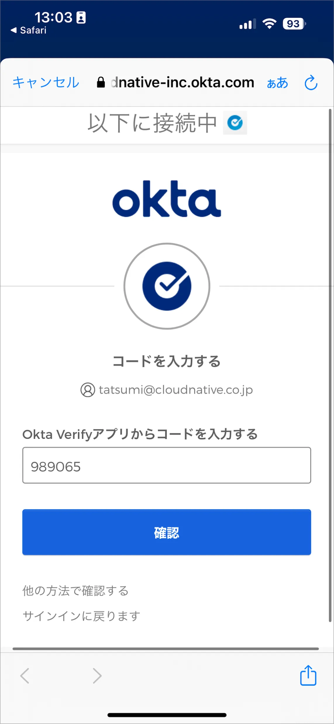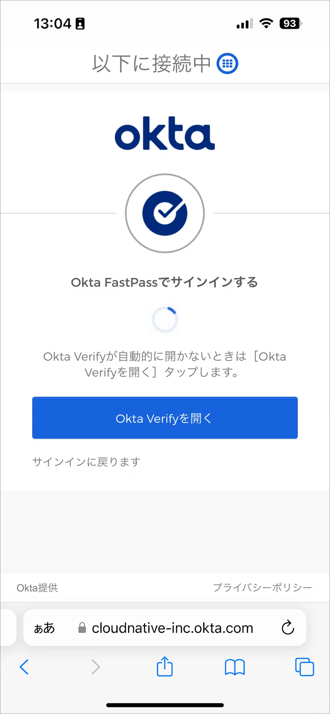 - サインインが完了したため、画面左上のOkta Verifyアプリを呼び出したSafariの部分をタップします。