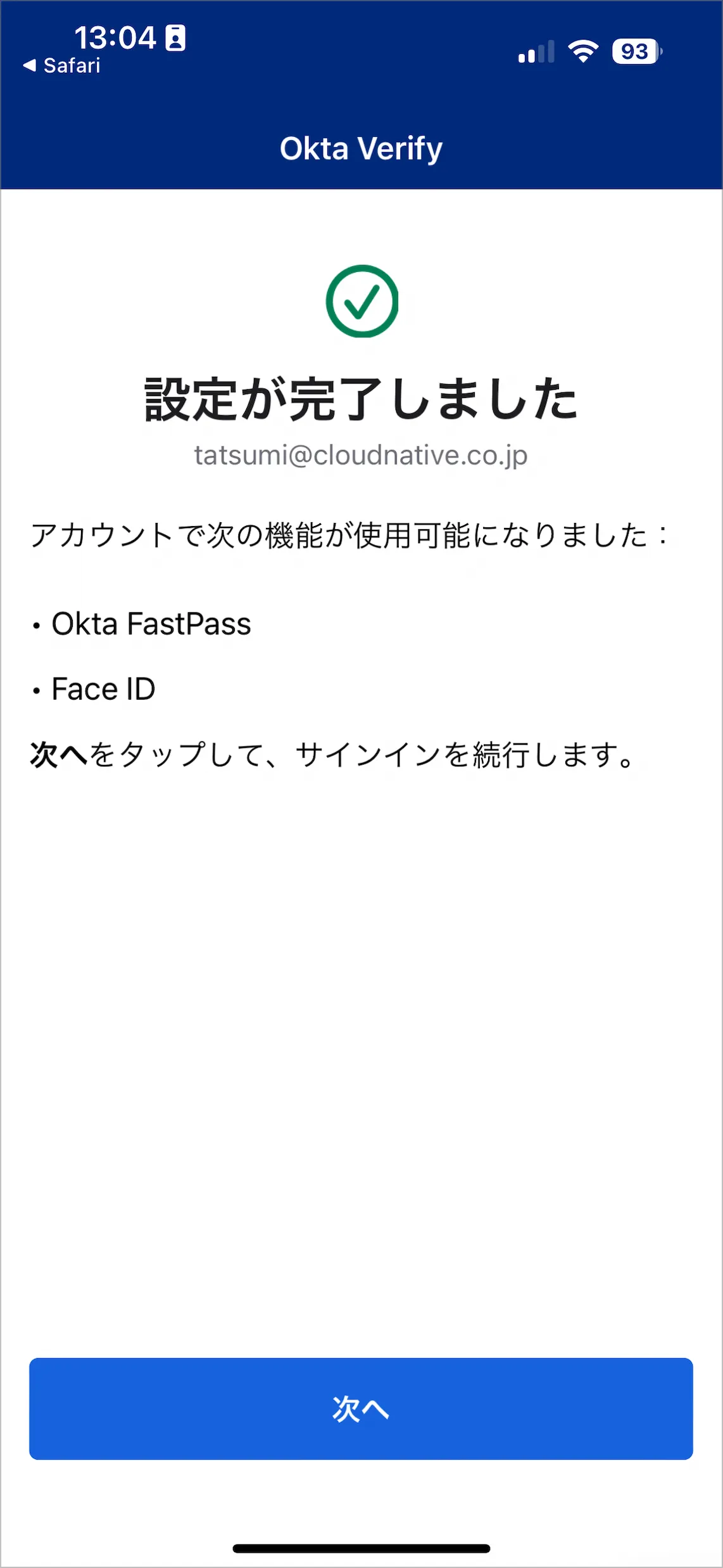 - 以下の画面が表示されれば設定は完了です。次へをタップします。