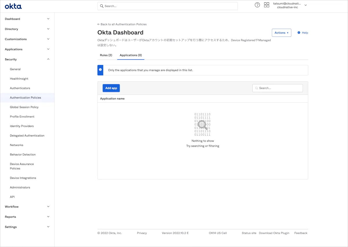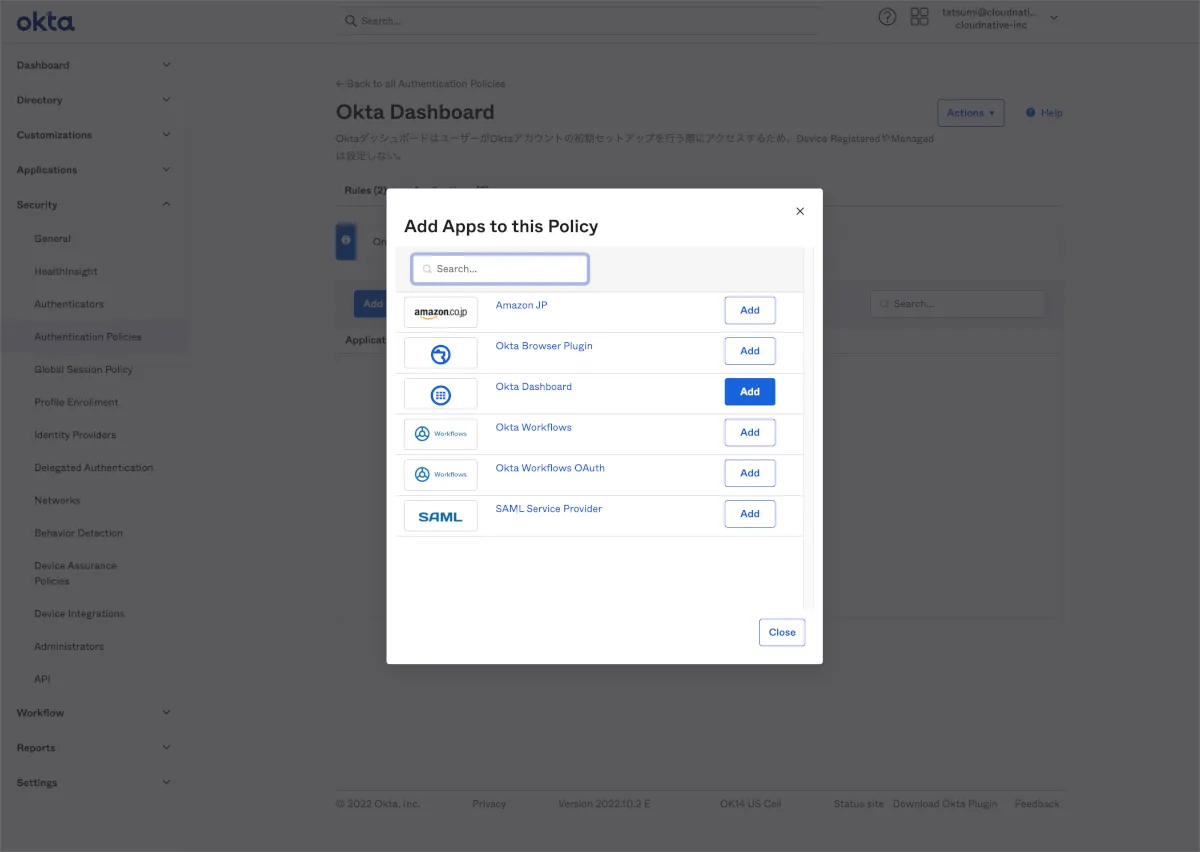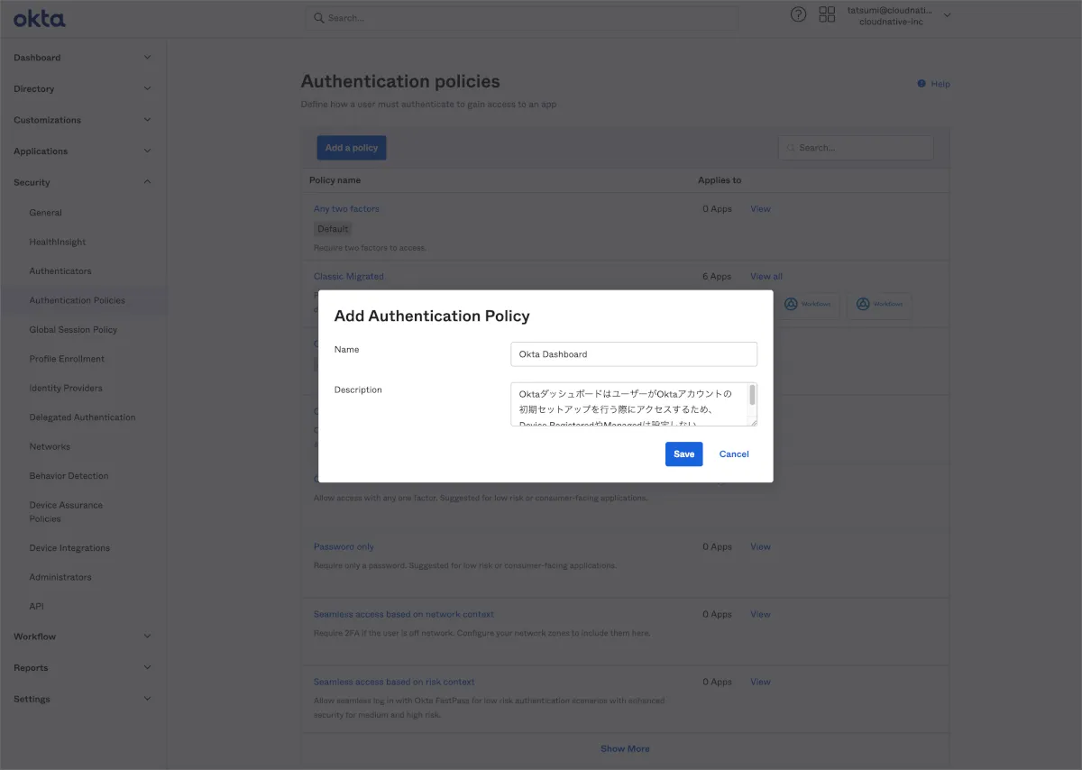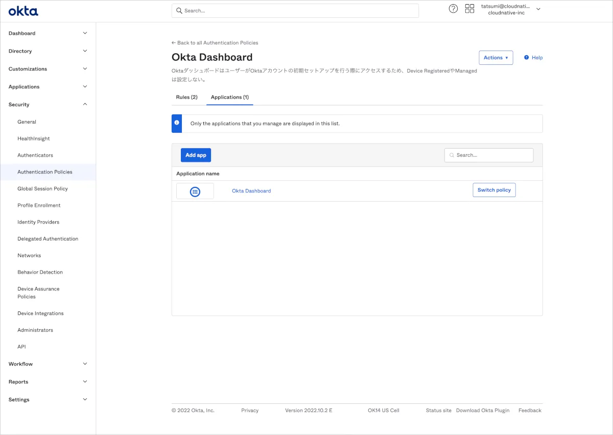 以下では実際にOkta Dashboard専用Policyを作成する方法をご案内します。