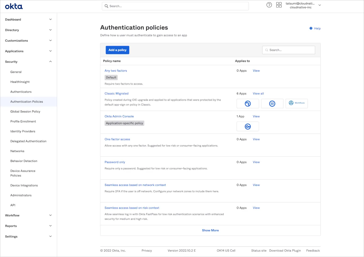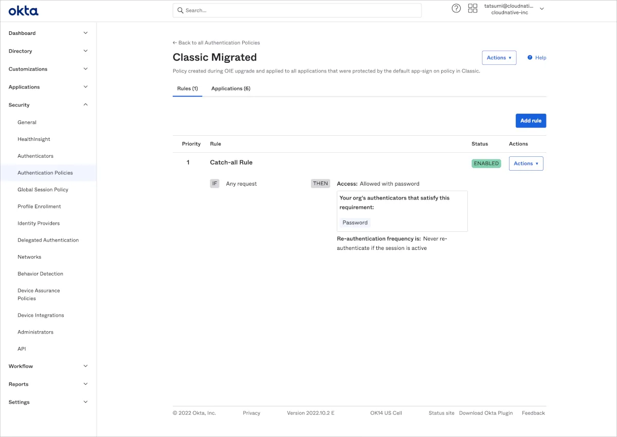 Classic Migrated Policyは仮のものと認識したほうがよさそうです。 今後、新しいアプリケーションを作成した場合は基本的にはDefaultのラベルがついた「Any two factors」というPolicyに紐づきます。 そのためAny two factors Policy内のRuleを整備し、既存のアプリケーションもAny two factors Policyに紐付けしなおしましょう。 また、Any two factors Policyとは別にOkta Dashboard専用のPolicyを作成し分離することを推奨します。Okta Dashboard専用のPolicy作成の詳細な理由と作成方法については後述します。
