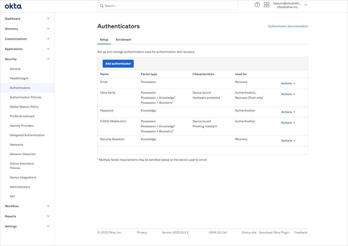 Okta管理画面>SecurityにAuthenticatorsの項目が表示されています。これはClassic環境では主にMultifactorという項目でした。また、Classic環境でAuthentication>Passwordで定義していたパスワードに関する内容もこのAuthenticatorsのSetupでOkta Verifyなどのような他の認証要素と並列で扱われるようになりました。