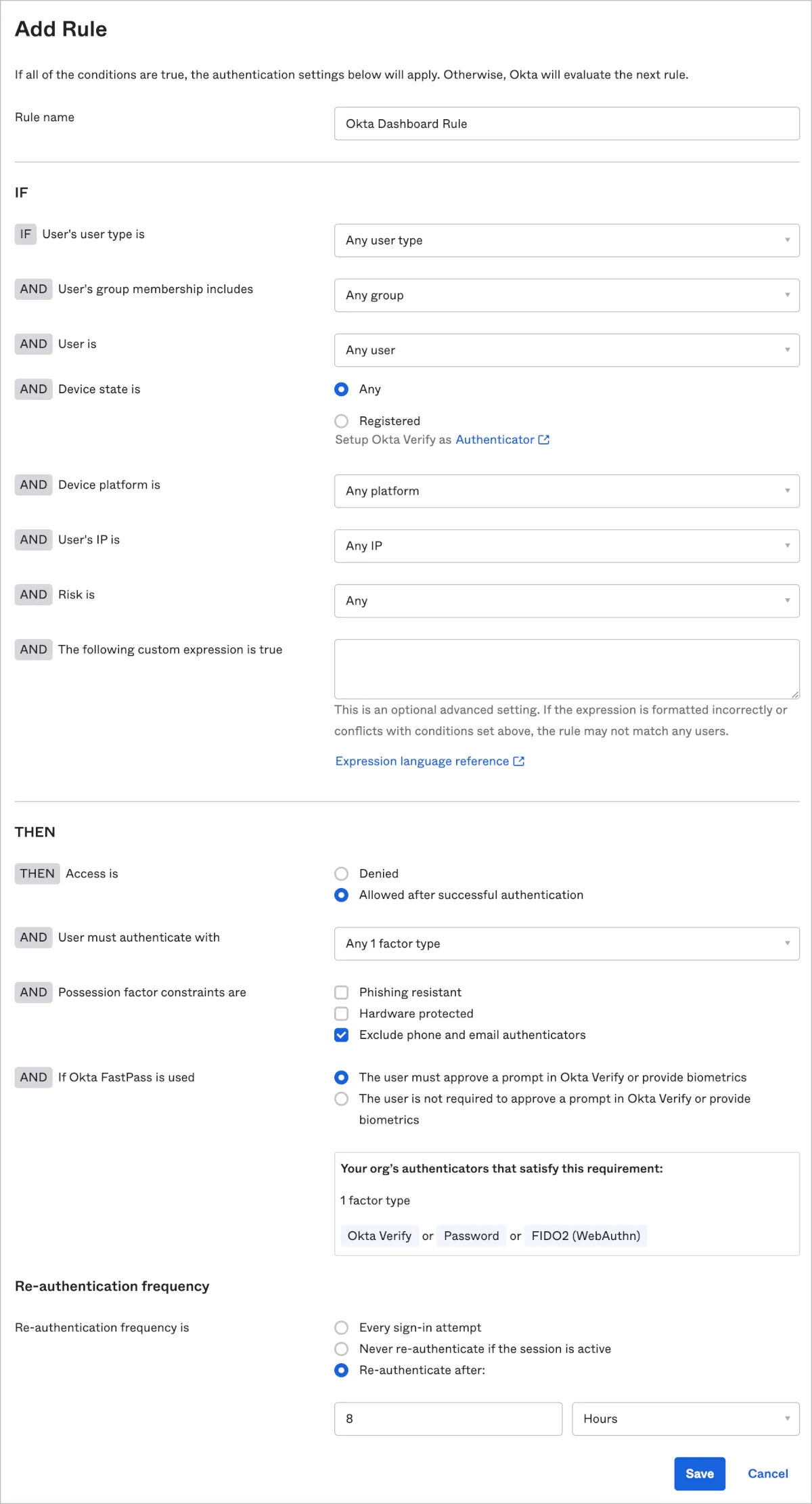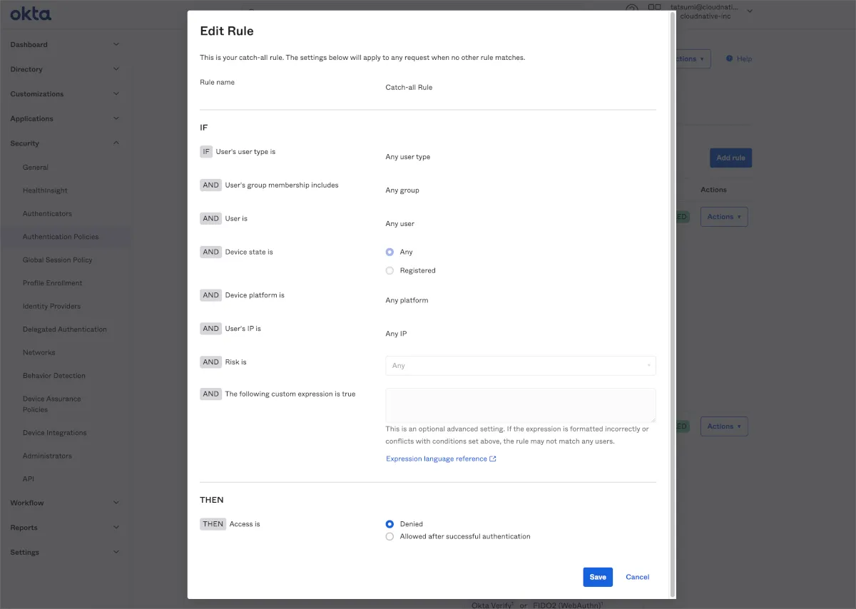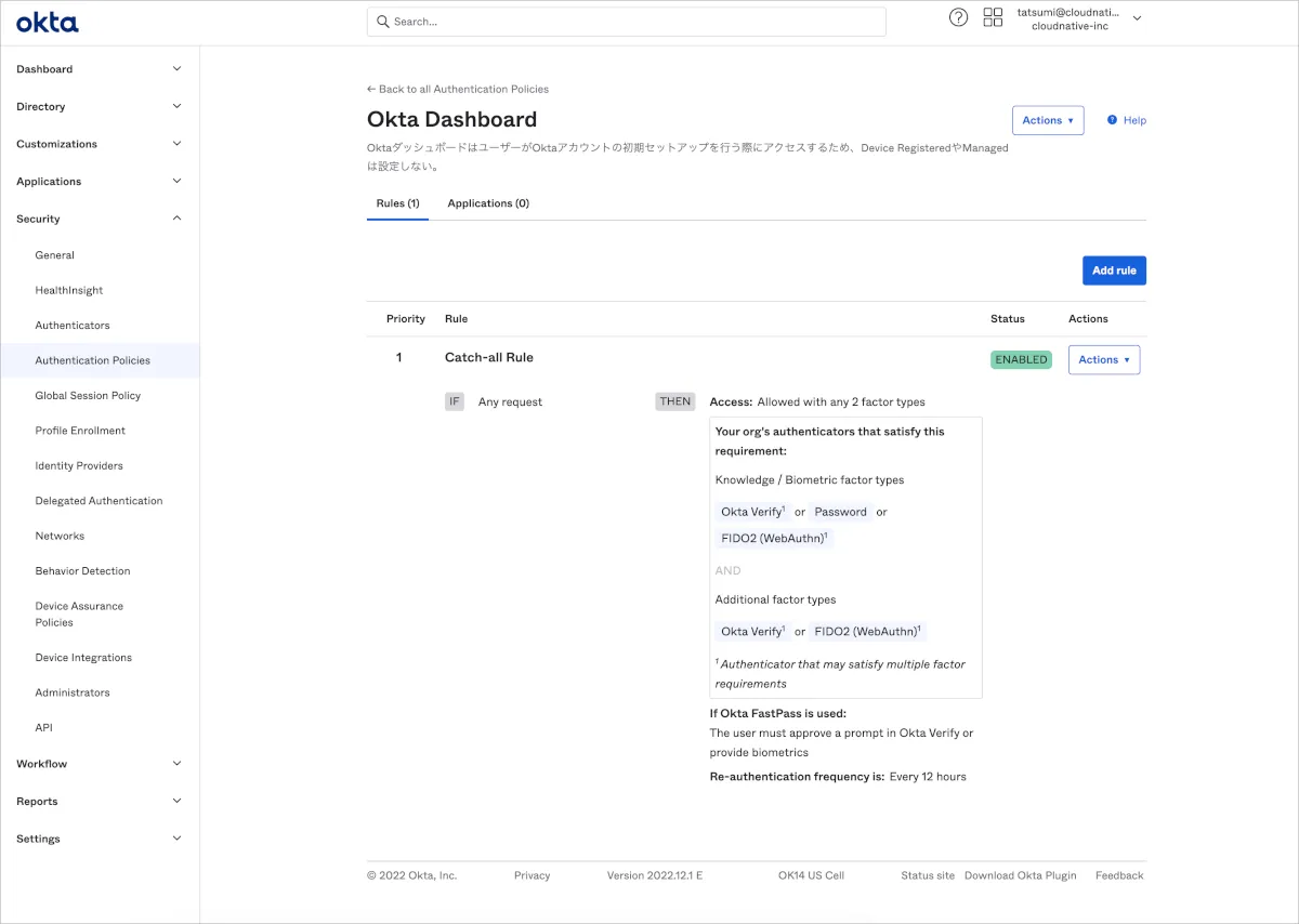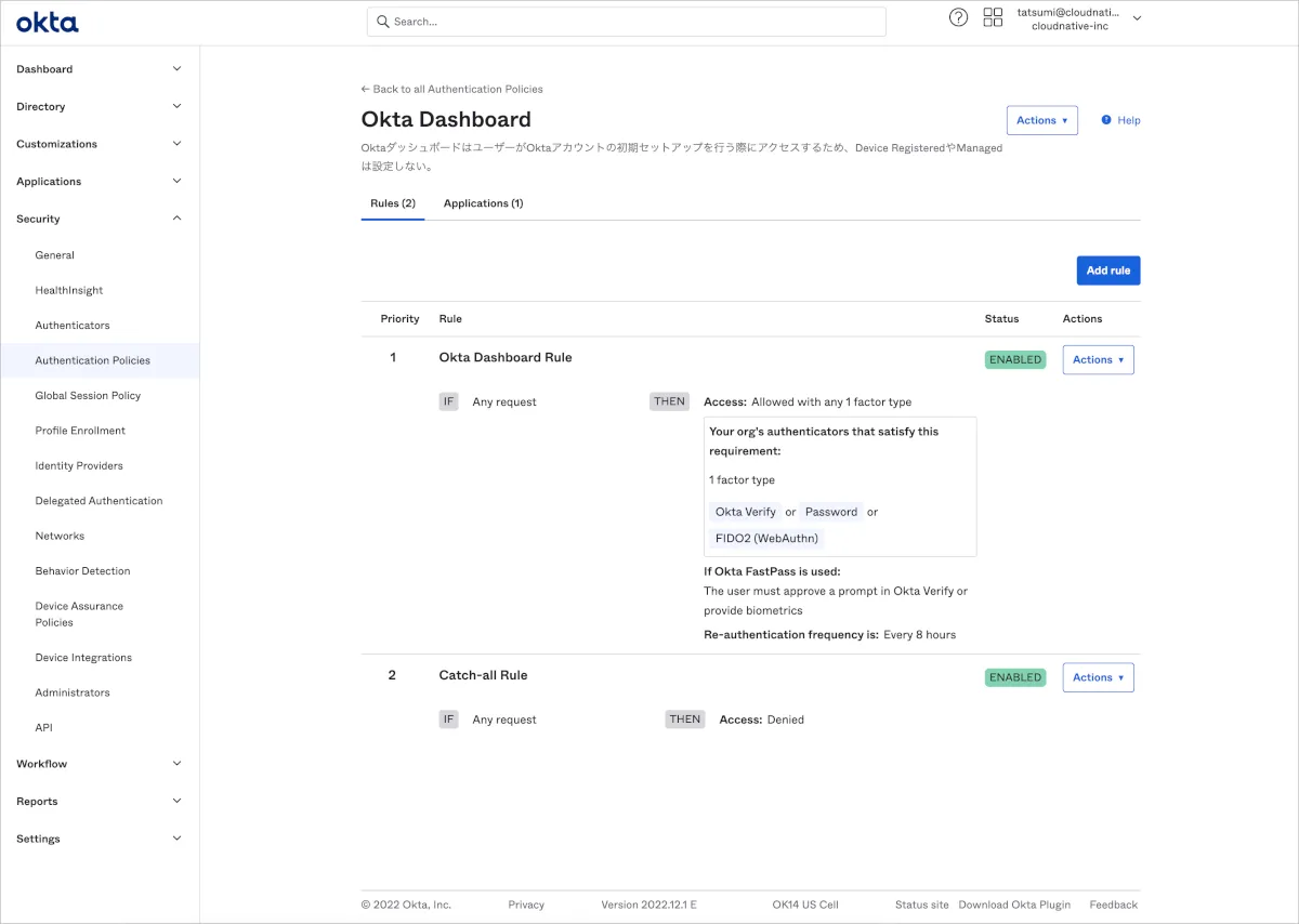 - Global Session PolicyでOkta FastPassを利用するためのRuleを作成