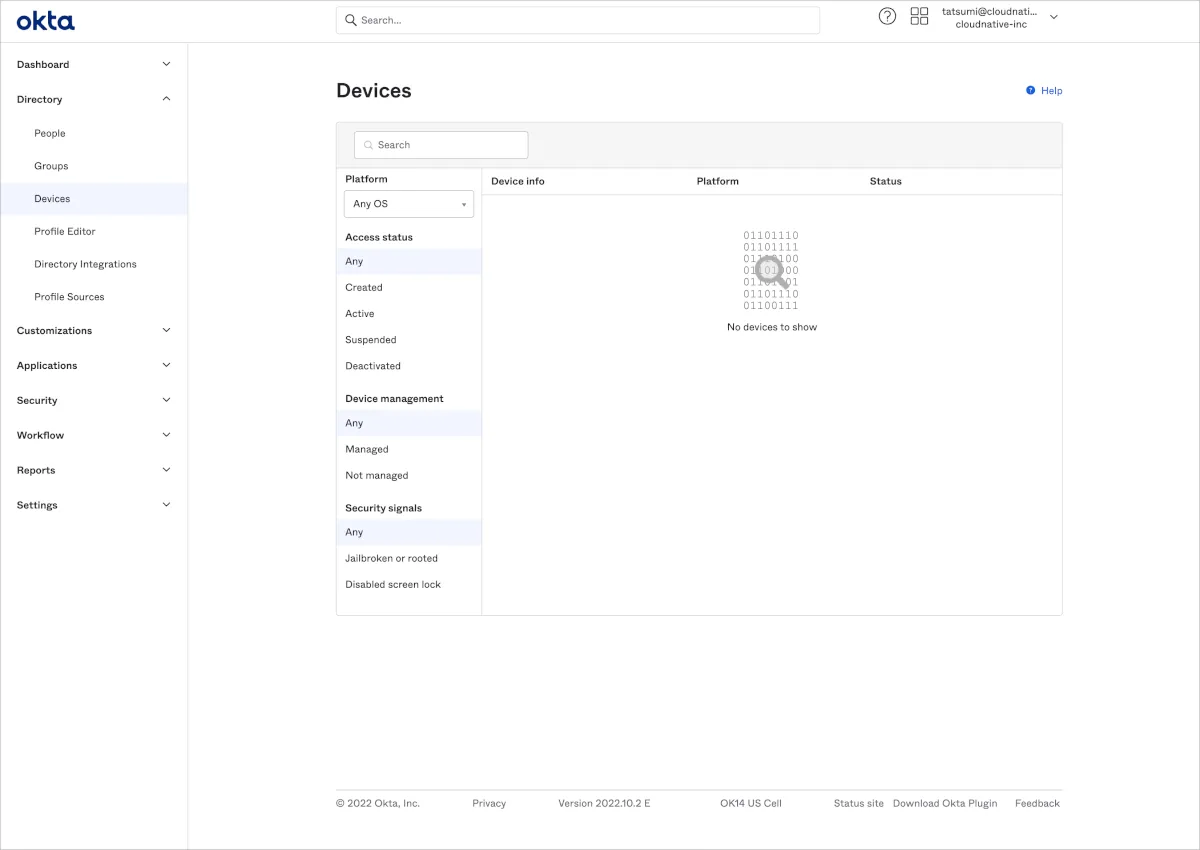 Okta管理画面>Directory内にDevicesが追加されています。OIE環境ではOkta Verifyアプリをインストールした場合に自動的にこのDevicesに端末情報が登録されます。