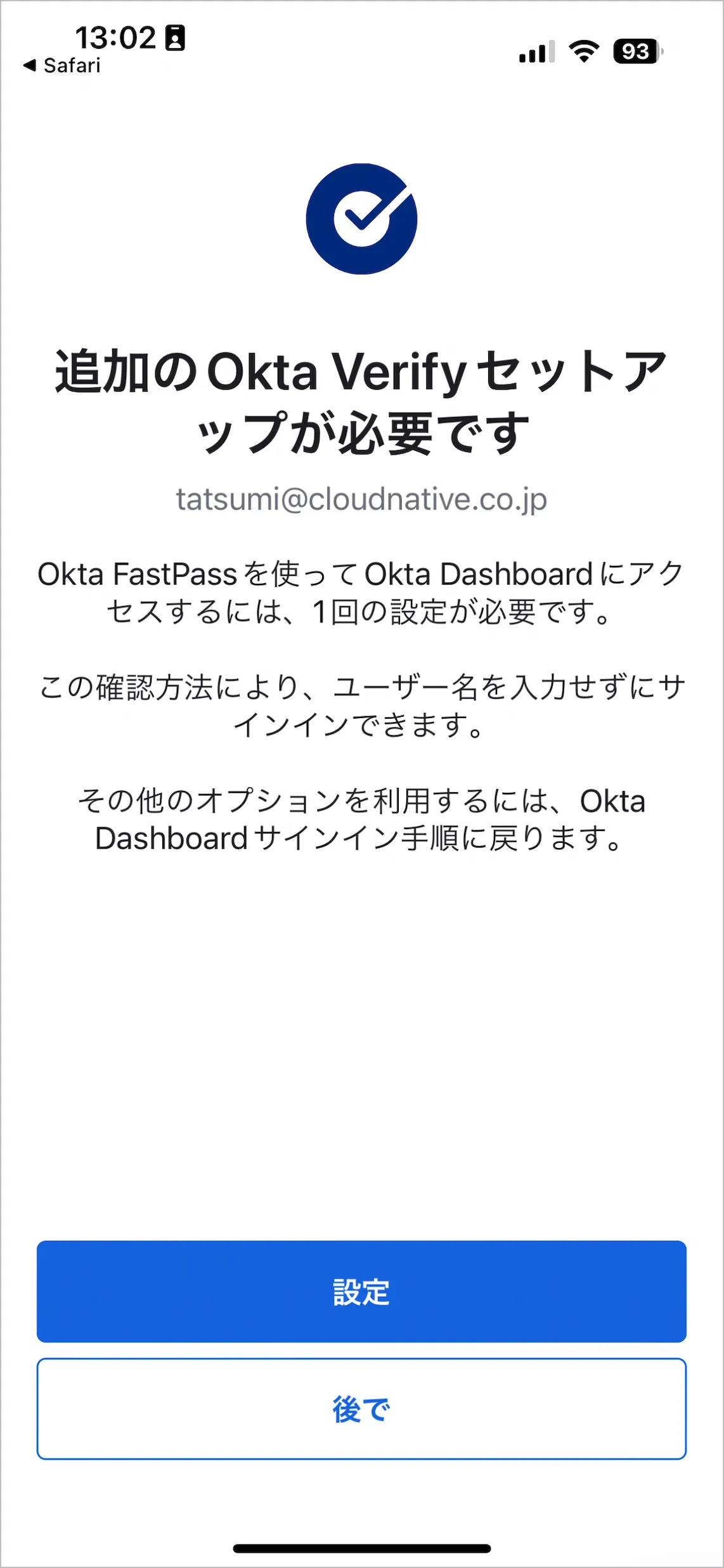 - Okta Verifyアプリに切り替わり以下の画面が表示されます。設定をタップします。