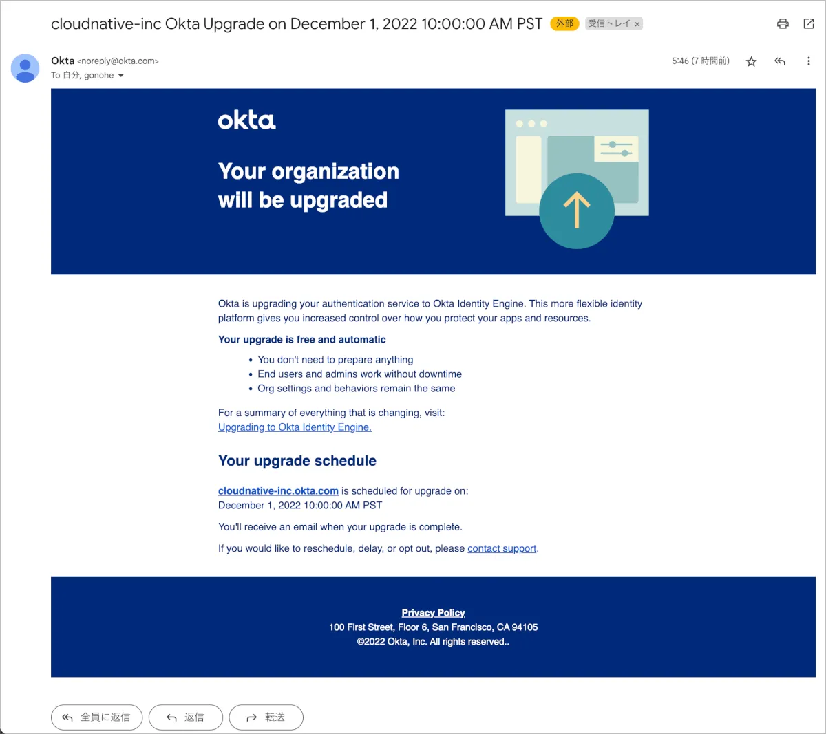 アップグレード時間である11時までに事前にメールやOkta上でアラートが表示されるようなことはありませんでした。