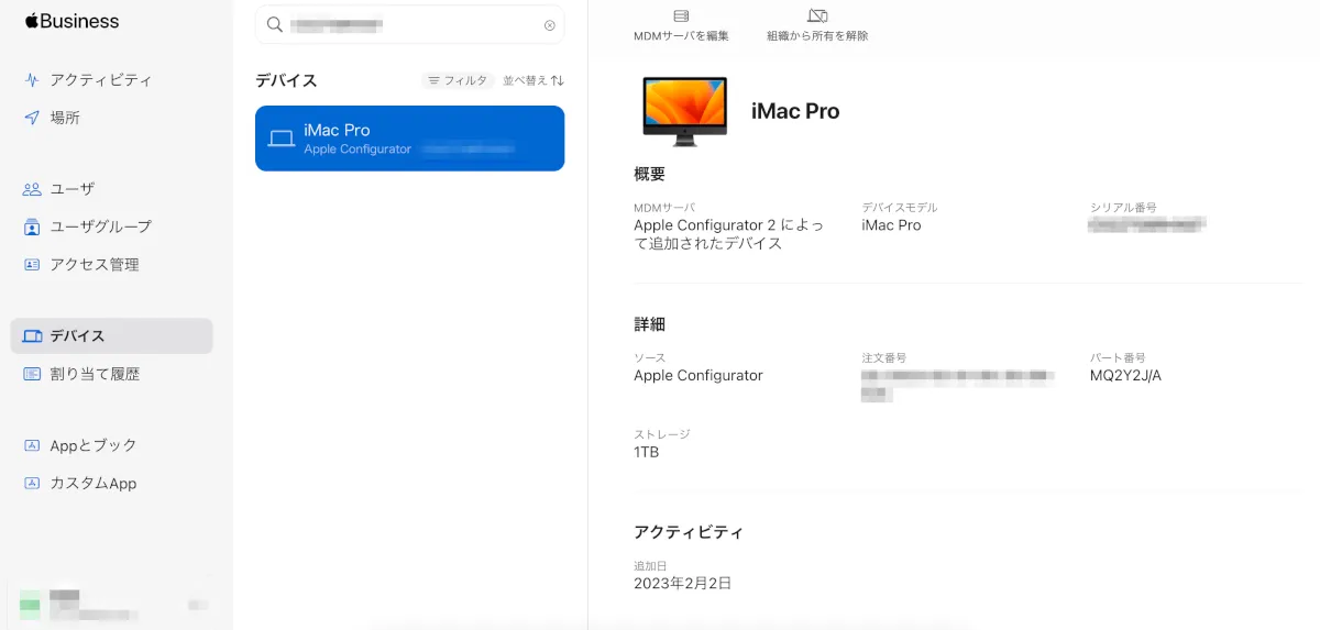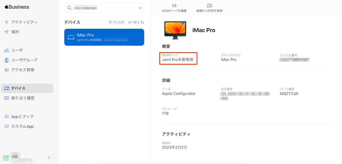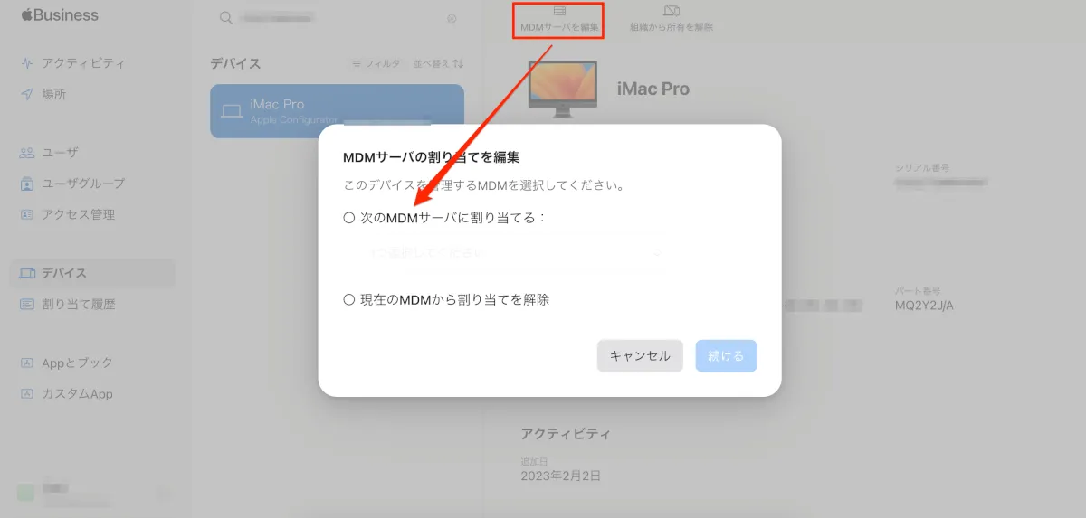 既にMDMサーバに割り当てされている端末の場合はこちらの画面から 割り当ての解除 または 別のMDMサーバへ割り当てを変更する事も出来ます。