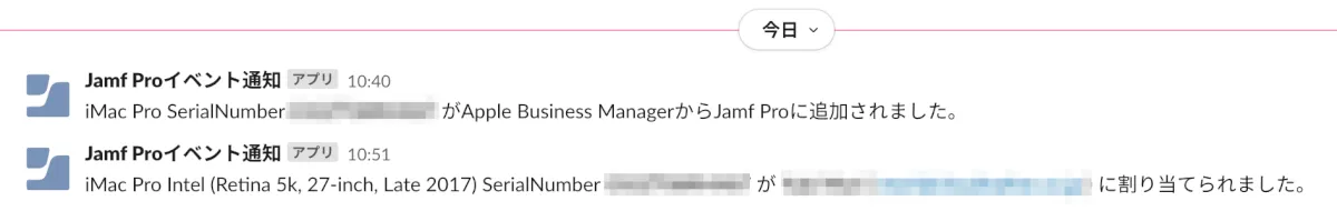 弊社環境ではJamf Proに端末登録が走った際に、Slackに通知が飛びます。