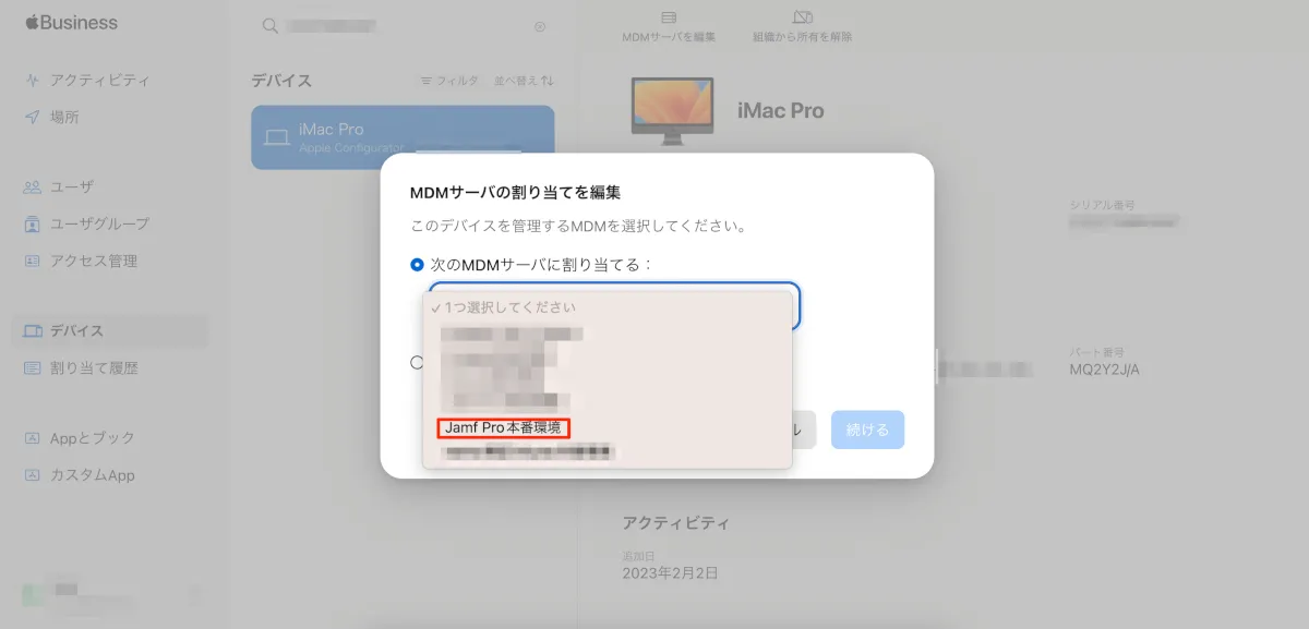 次にABM上で該当端末が所属するMDMサーバの選択を先に実行します。