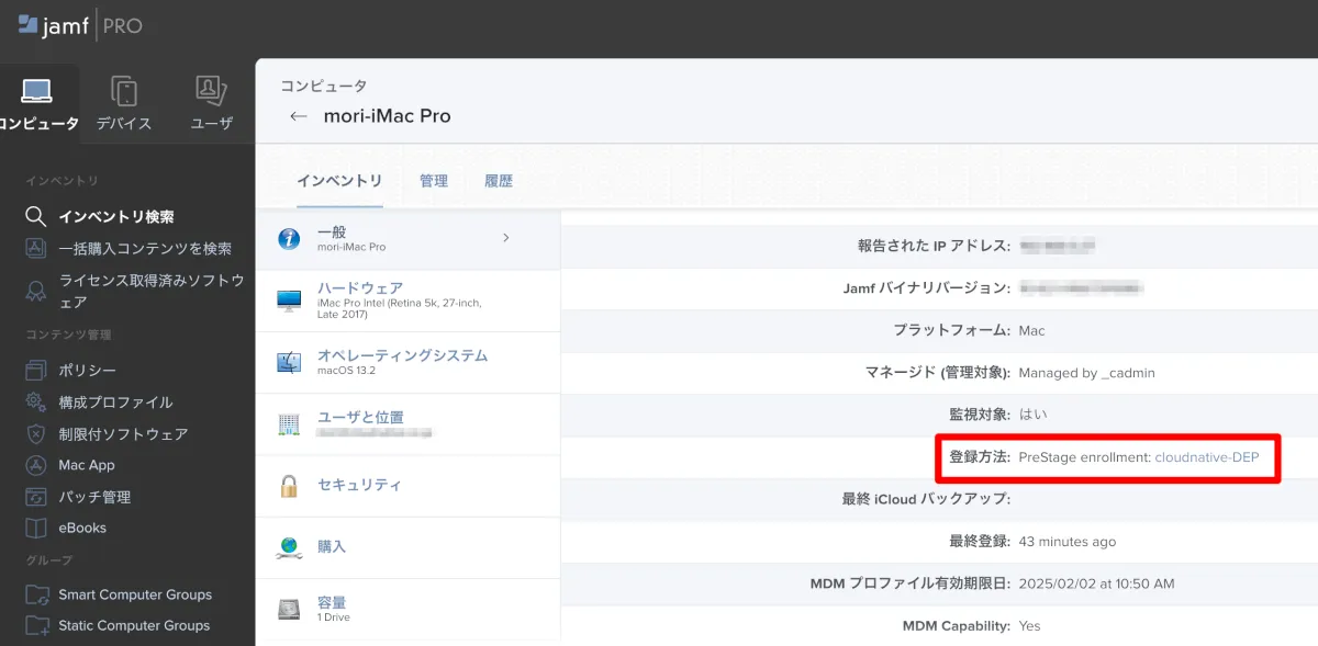 登録が終わった後にJamfのコンピュータ情報を開くと「登録方法」が先ほどと異なり「cloudnative-DEP」に切り替わっていることが確認できますね。