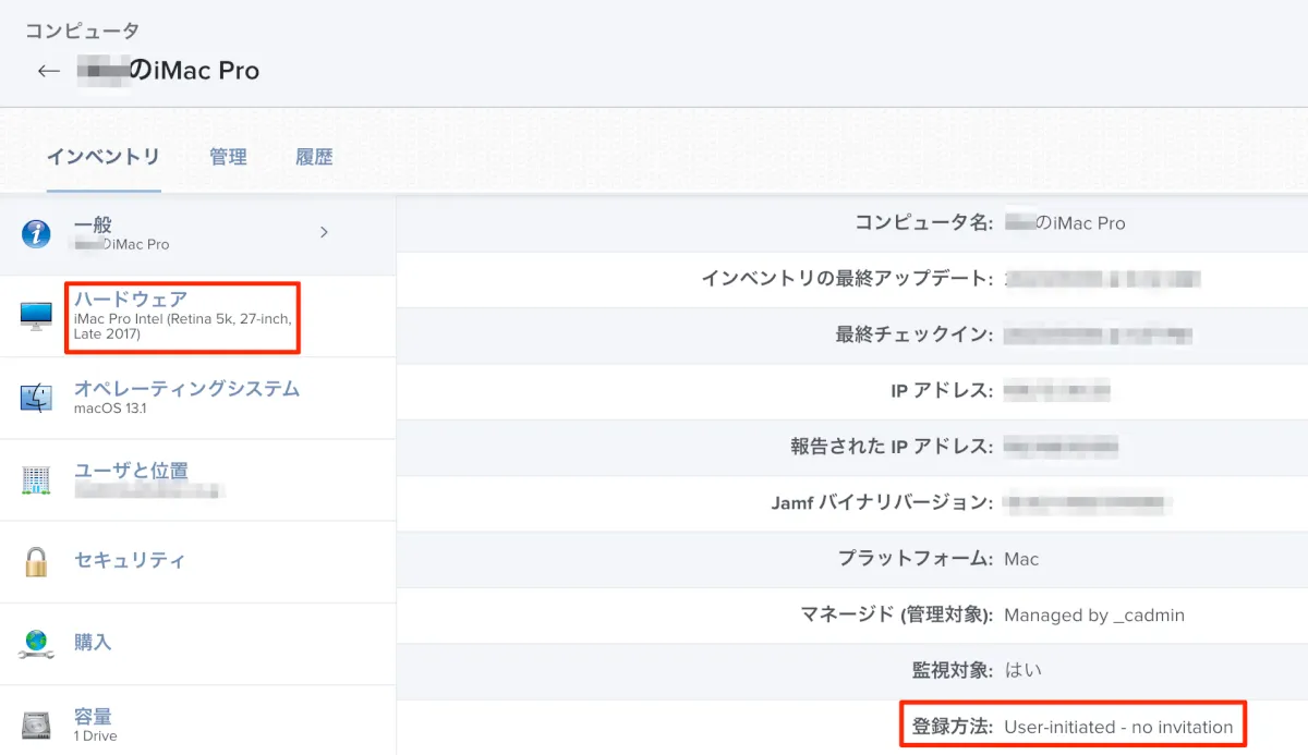 こちらはJamfの管理画面ですが、ハードウェアが「iMac Pro Intel(Retina 5k,27-inch,Late 2017) 」(MQ2Y2J/A)であることと、このタイミングではADE登録されてない。いうことがわかるかと思います。