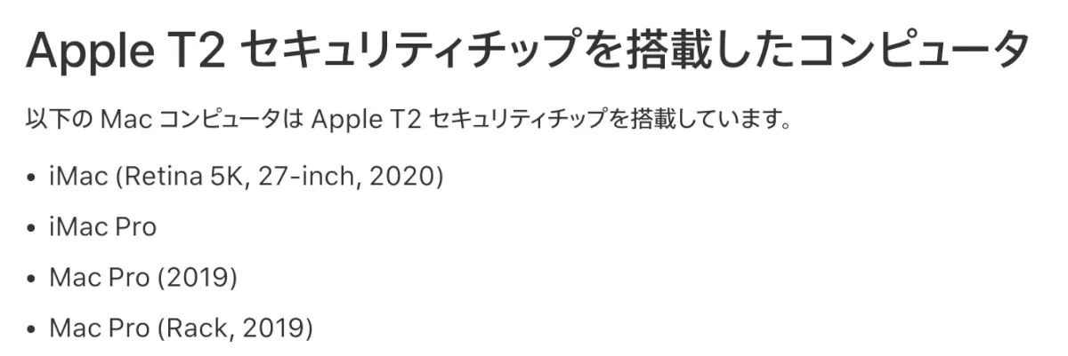 Apple T2 セキュリティチップ搭載モデルのMacが対象となっています。