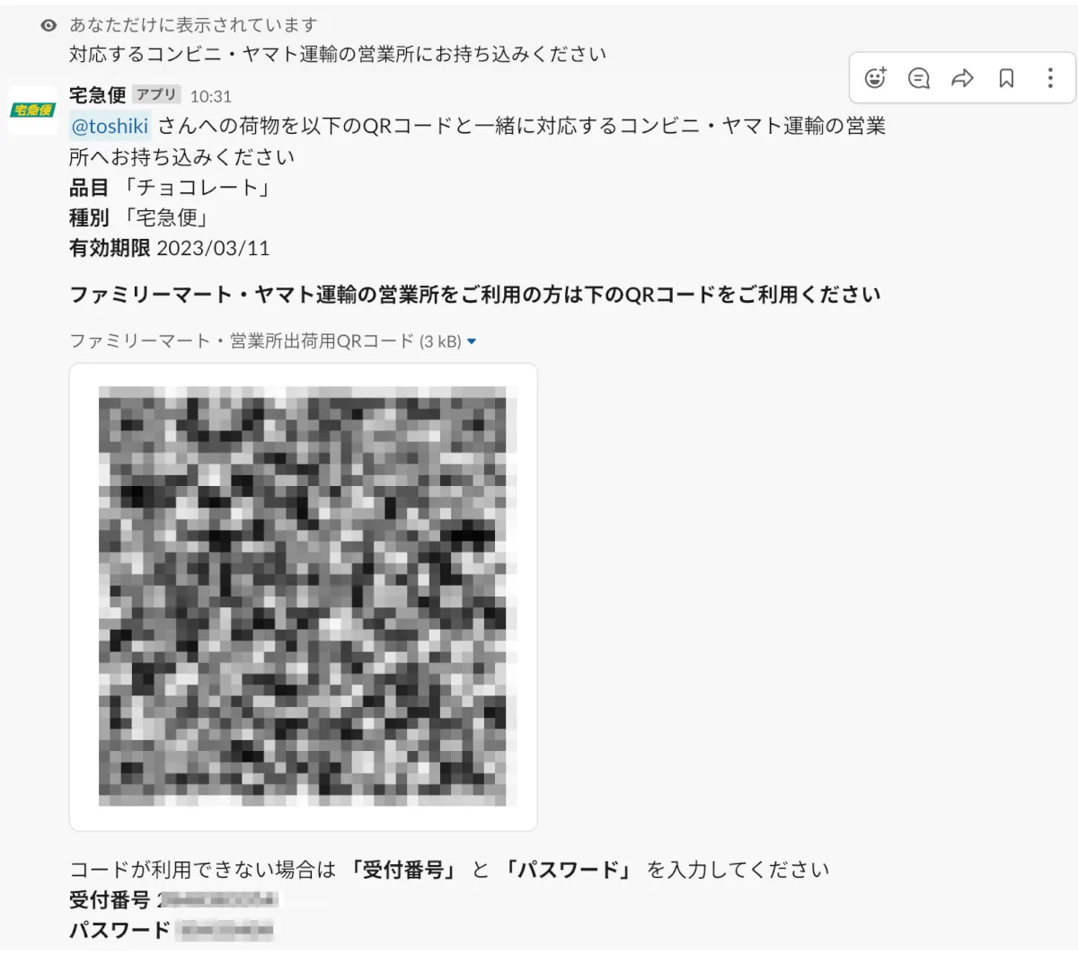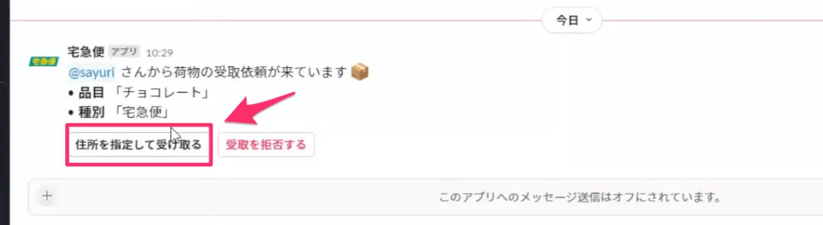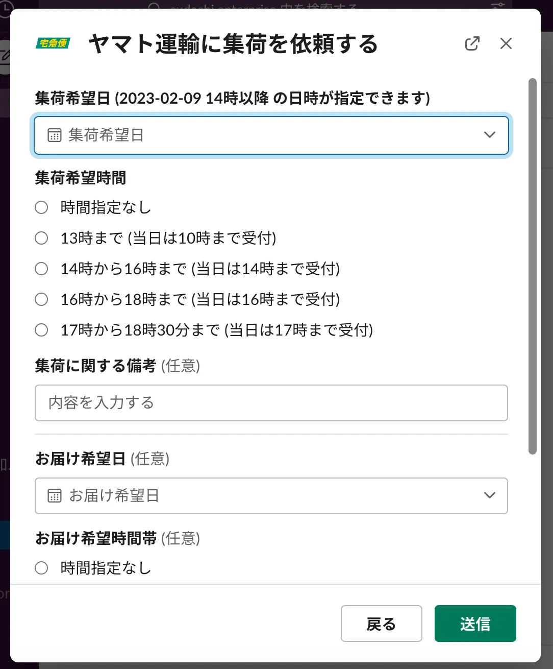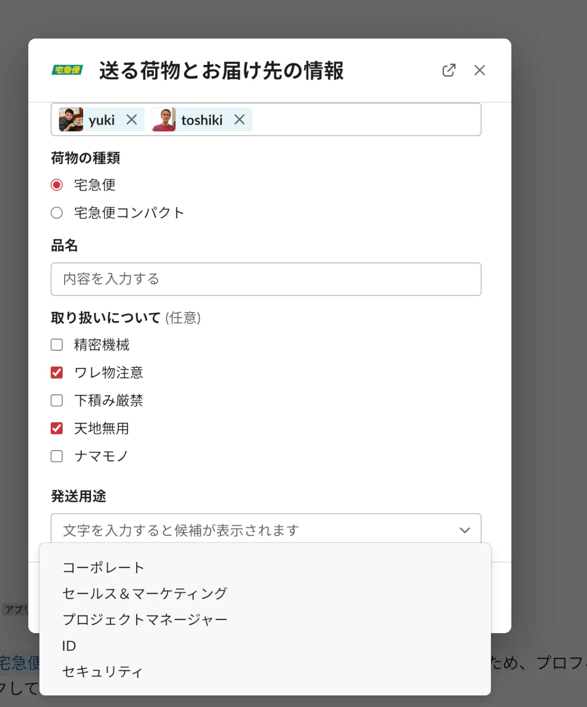 同じSlackワークスペース内ですと、ユーザーを簡単に指定して配送手配ができます。