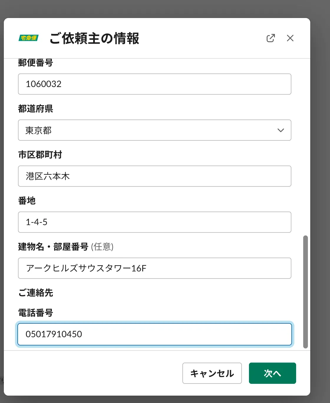 住所を指定して受け取るをクリックすると、依頼主情報と同じようにモーダルがでるので入力をしてもらいます。