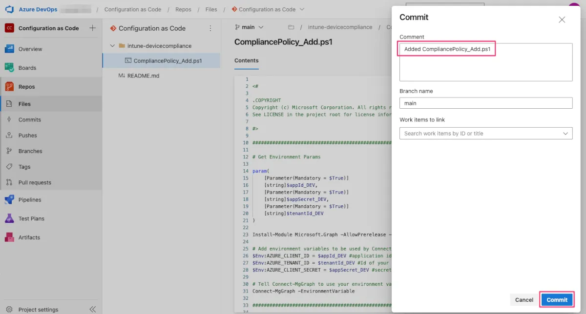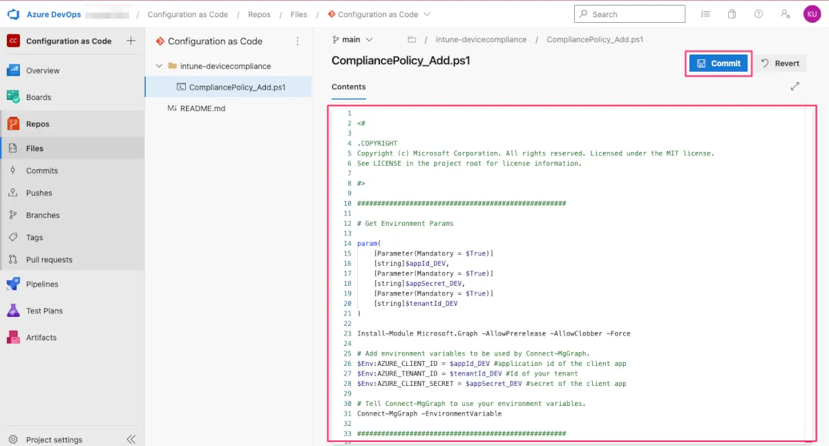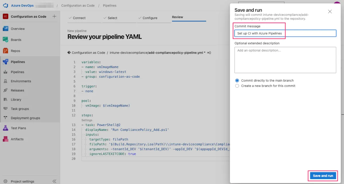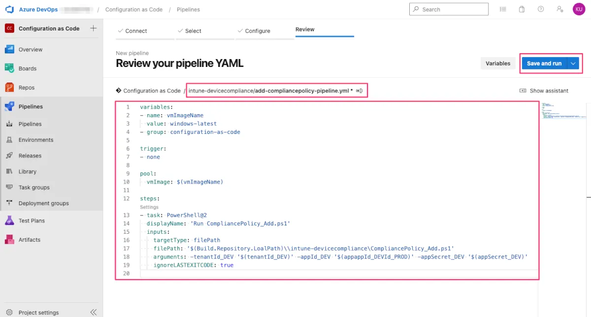 パイプラインの定義ファイルの設置場所は任意で問題ないですが、今回は元記事通りintune-devicecompliance/add-compliancepolicy-pipeline.ymlとします。定義は下記のようにしました。