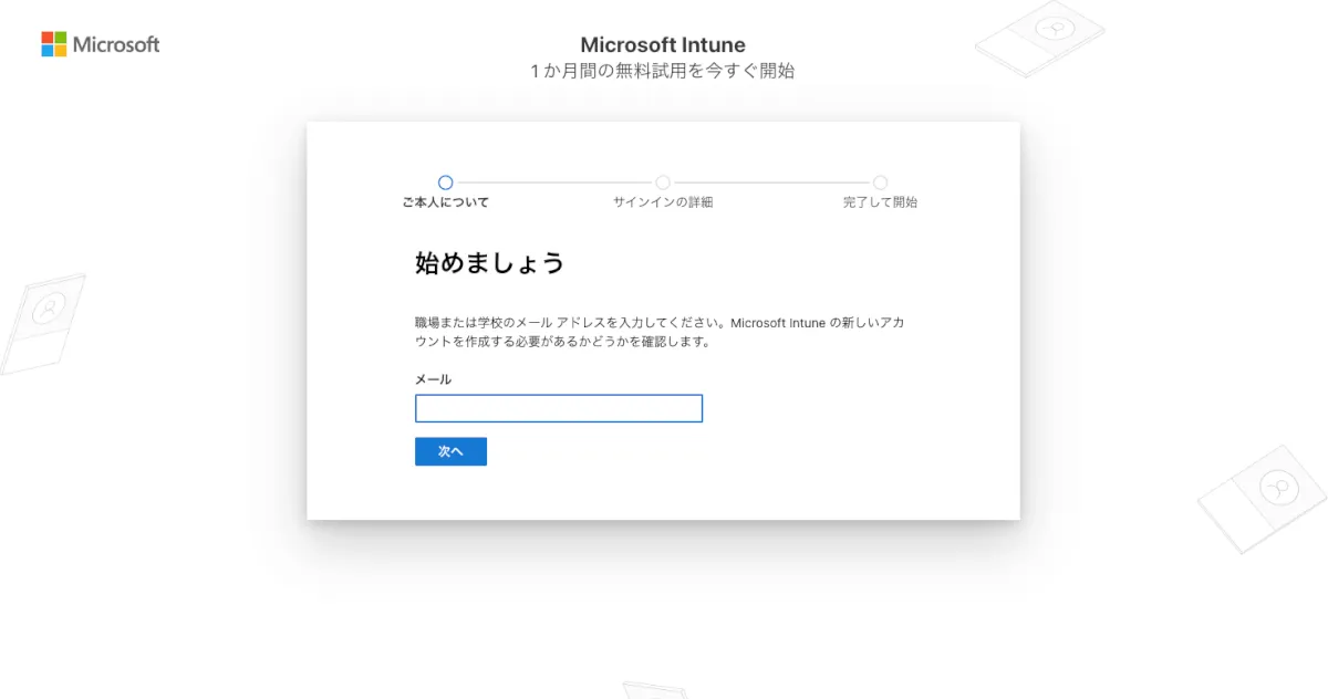 まず試用版のIntuneを用意したので、念の為この手順を軽く紹介します。クイック スタート: Microsoft Intune を無料で試す | Microsoft Learnに登録手順と登録のためのリンクが書かれているのでこちらから2つの環境を作成しましょう。(1つは次回使います)