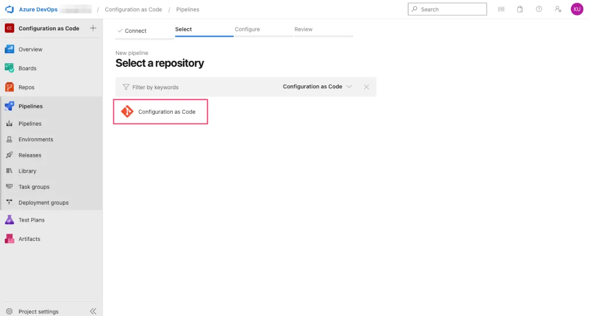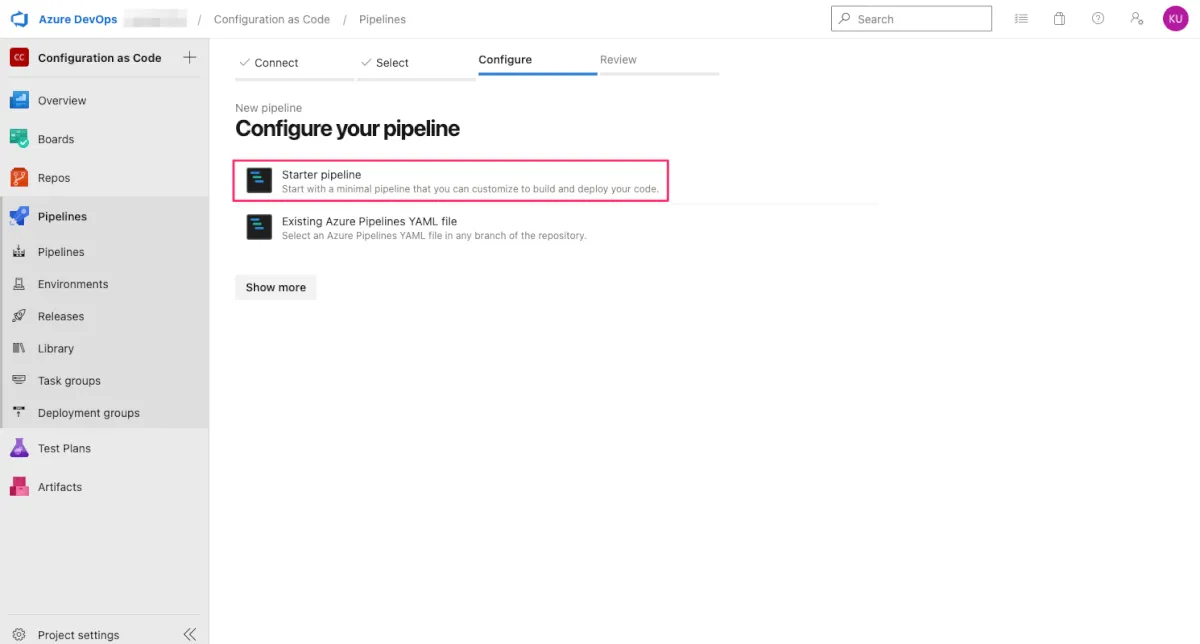 パイプラインの定義は未作成のため「Starter pipeline」を選択します。