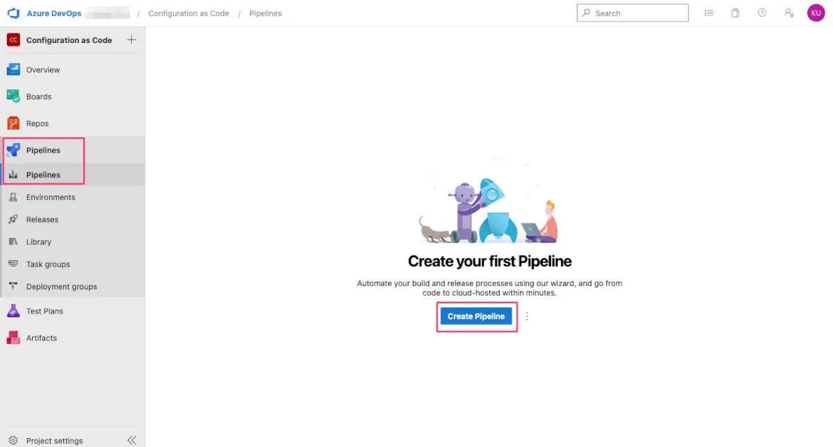 いよいよパイプラインを作ります。「Pipelines -> Pipelines」から「Create Pipeline」します。