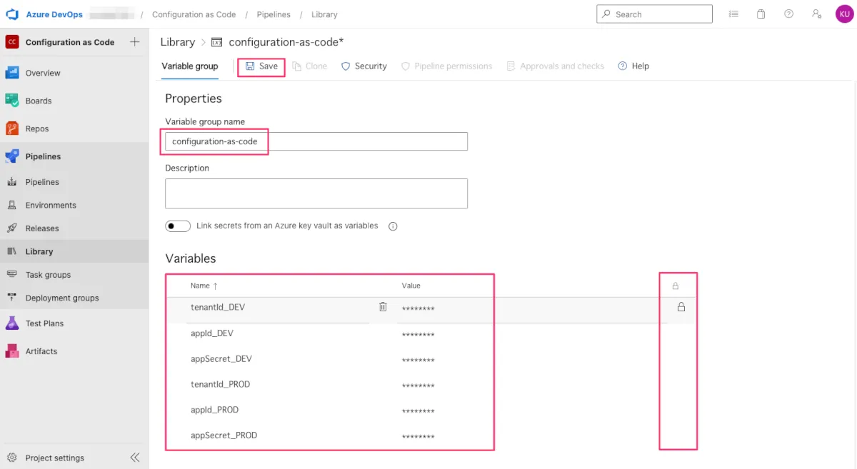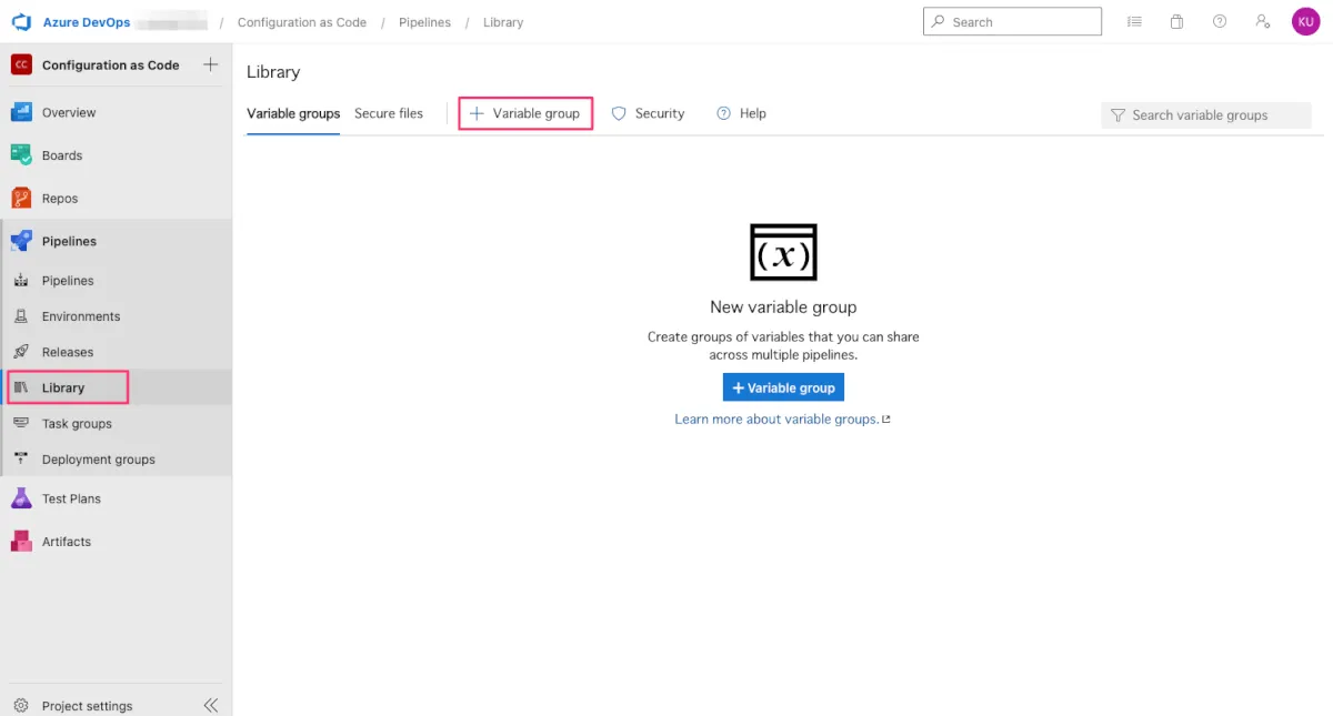 続いてデプロイの準備にかかります。上記のスクリプトでは操作するためのアプリの認証情報を、スクリプト実行時の引数から取るように設計されています。これをAzure DevOpsのプロジェクトで管理するために変数グループを作成します。「Pipelines -> Library」から「Variable group」を作成します。