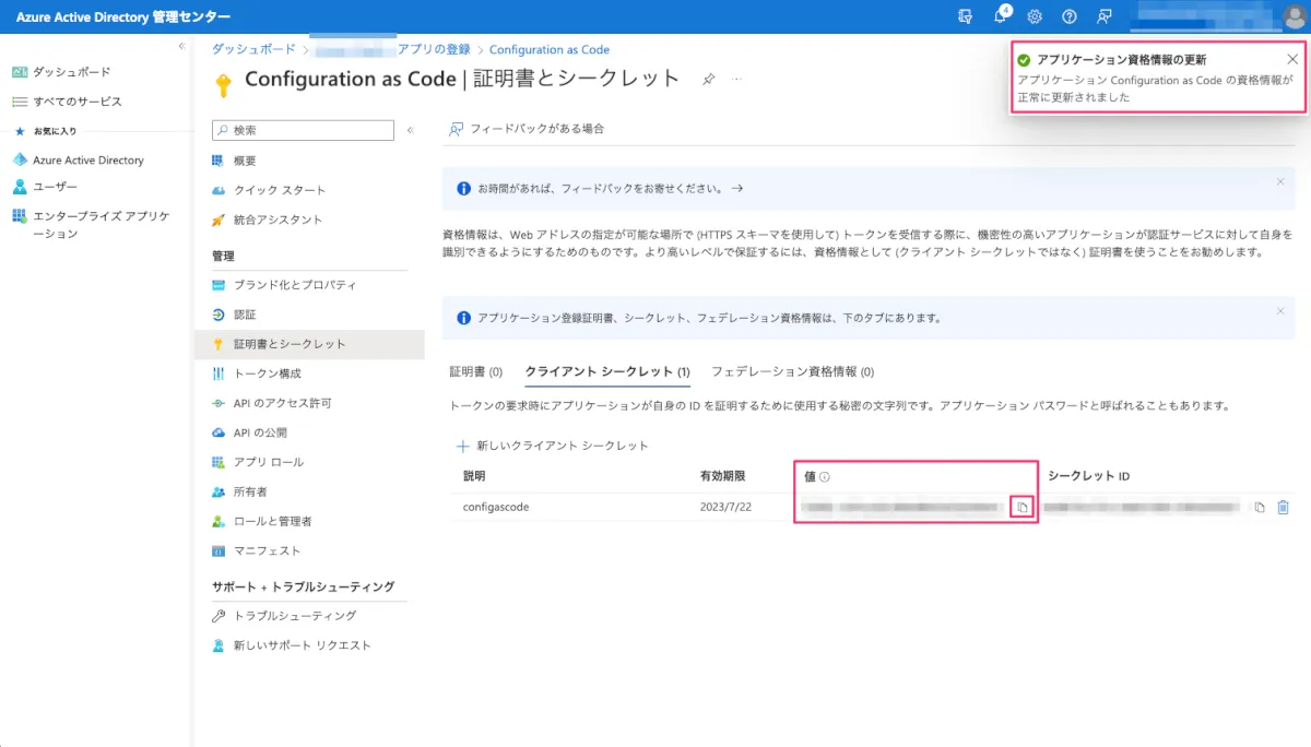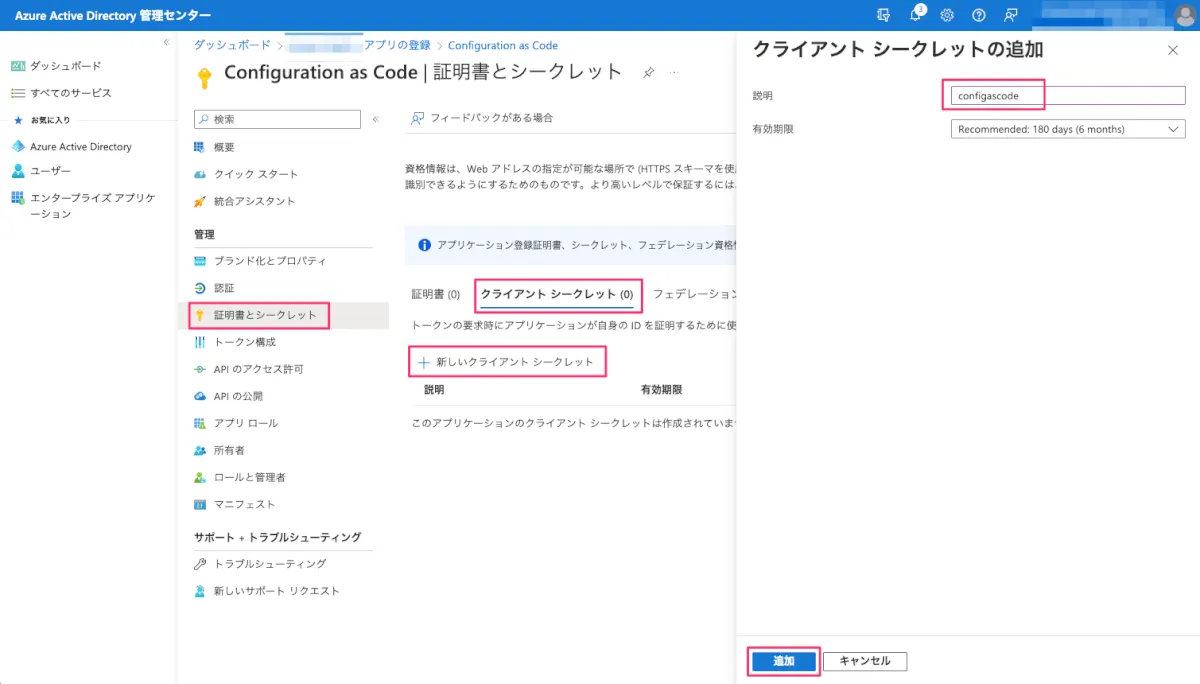 続いて、外部からこのアプリを利用するために必要なクライアントシークレットを作成します。「証明書とシークレット -> クライアントシークレット」から「新しいクライアントシークレット」を押し適当な名前(今回は元記事通りconfigascode)をつけて「追加」します。