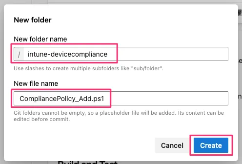 フォルダ構成などは任意で構いませんが、今回は元記事通りintune-devicecomplianceフォルダを作成しその配下にCompliancePolicy_Add.ps1ファイルを作成します。