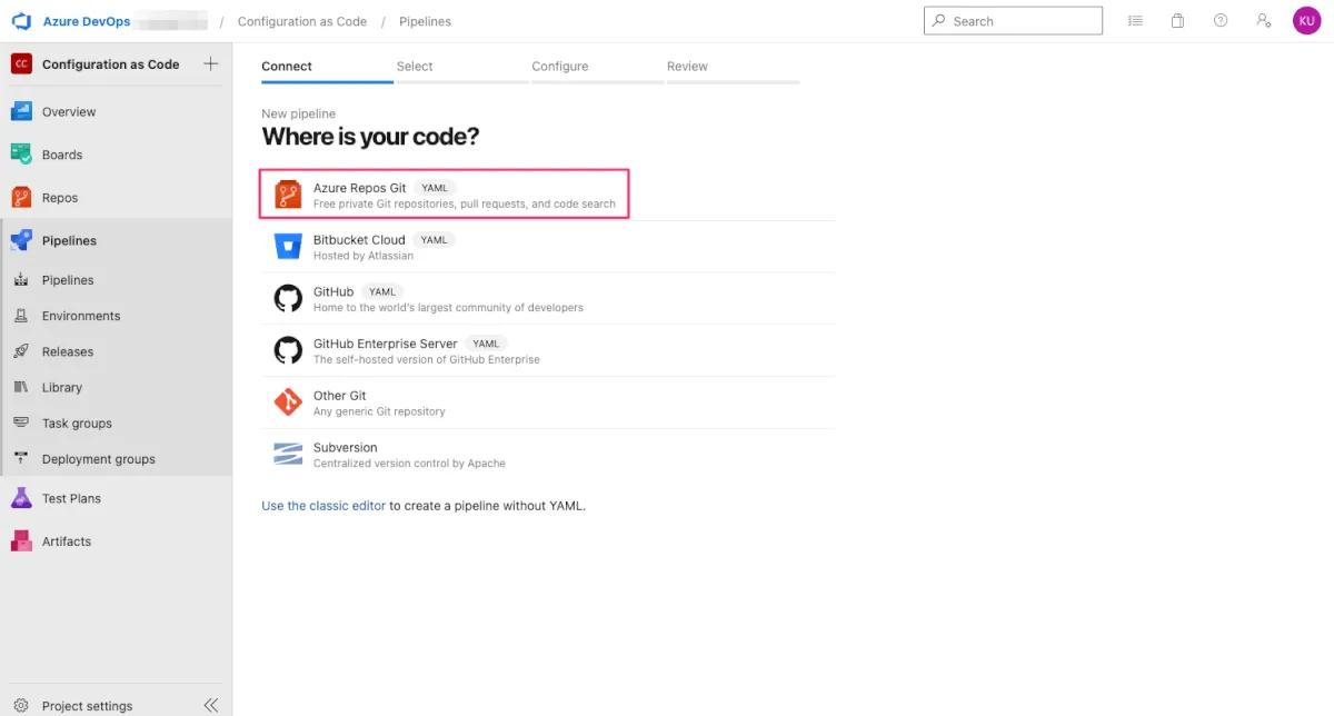 どのリポジトリを利用するか聞かれるので「Azure Repos Git」を選択します。