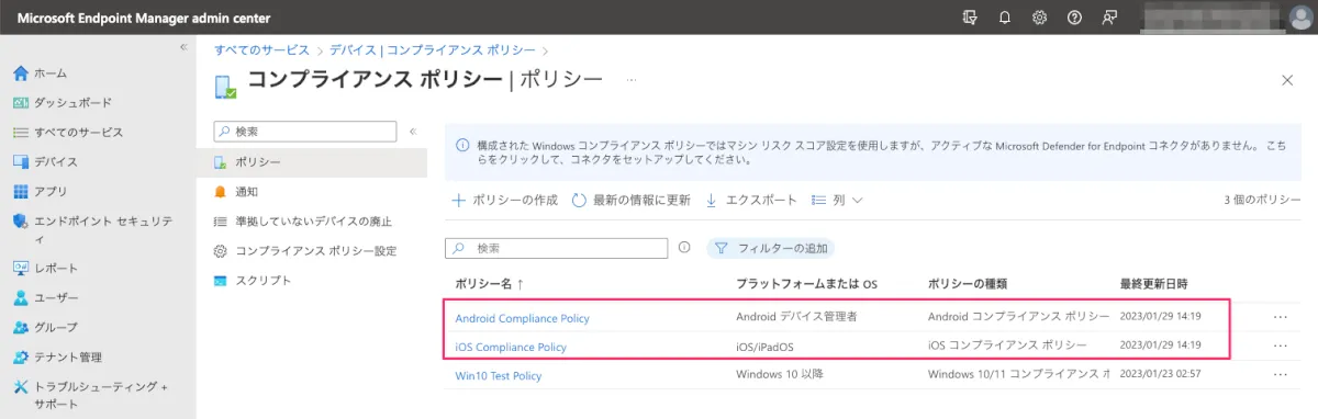 デプロイされた結果を確認します。Microsoft Endpoint Management admin centerへアクセスし、デバイスコンプライアンスポリシーを開きます。iOSとAndroidのポリシーが追加されていることが確認できます。(下記は別途手動で設定したWindows10のポリシーも表示されています)