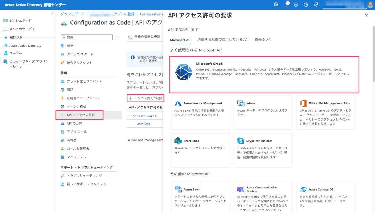 次に作成したアプリにアクセス許可を設定します。「APIのアクセス許可」から「アクセス許可の追加」を選択し、「Microsoft Graph」を選択します。