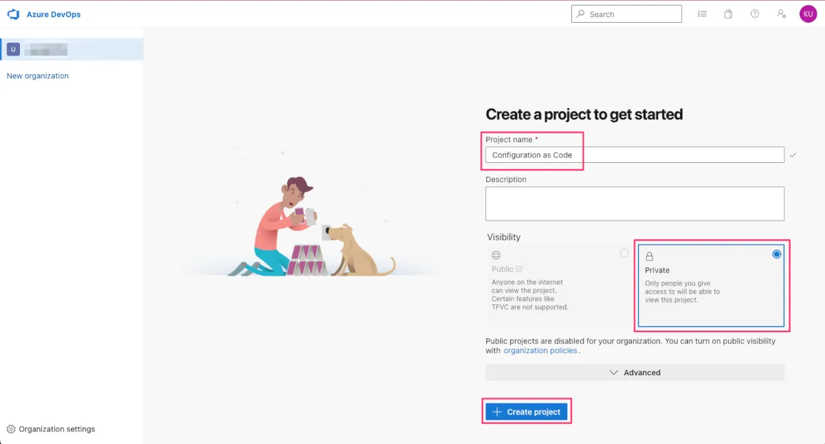 組織が作成できたら、続いてプロジェクトを作成します。名前を適当に入力し(今回はConfiguration as Code)、「Private」を選択して作成します。