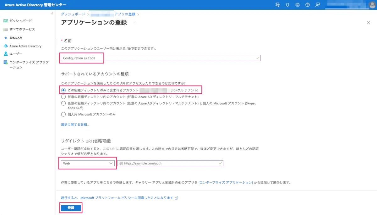 適当な名前を入れます。ここでは元記事通りConfiguration as Codeとしています。「サポートされているアカウントの種類」はそのままで、「リダイレクト URI (省略可能)」は右側の値は空でいいのですが、プルダウンリストは選択する必要があったためWebを選択しています。これで「登録」します。