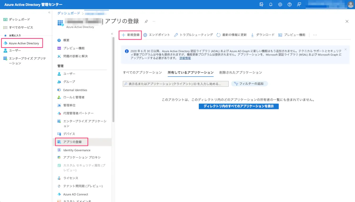 Intuneの環境が出来上がったらAzure Active Directory 管理センターで外部から操作するためのアプリを登録します。「Azure Active Directory -> アプリの登録」から「新規登録」を選択します。