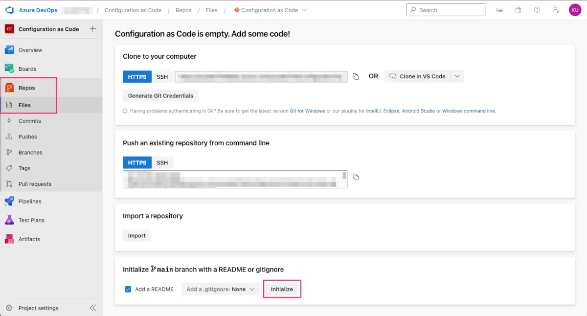 プロジェクトを作成したら、Gitリポジトリを作成します。元記事ではCloneしてローカルで実行する方法も紹介されていますが、今回は簡単な手順しか実施しないためWeb上で直接リポジトリの操作を行います。「Repos -> Files」を開き、下の方の「Initialize」を押してファーストコミットします。