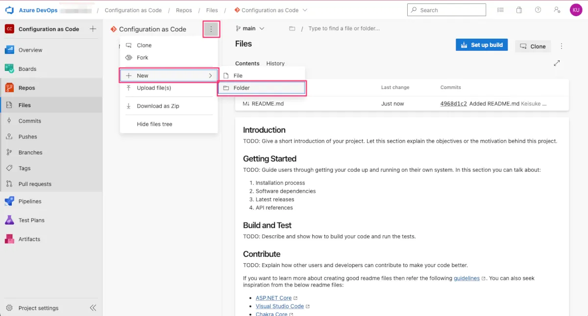 続いて、実際のIntuneを操作するロジックとなるPowerShellスクリプトを作成していきます。リポジトリの三点リーダーから「New -> Folder」を選択します。