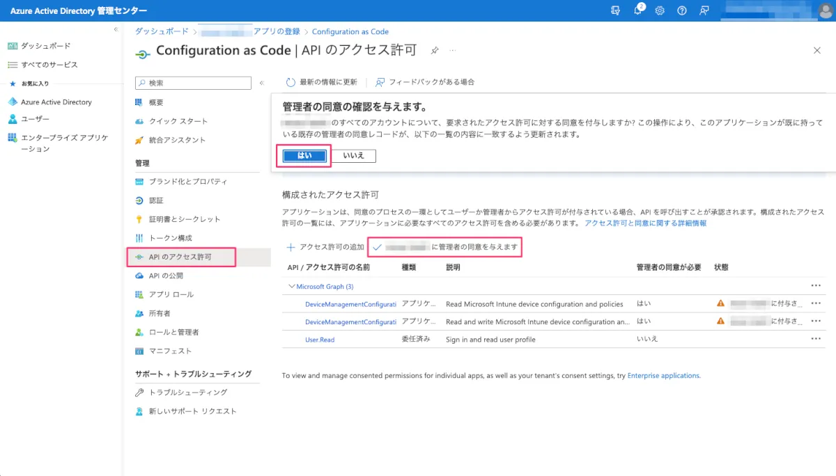 許可を追加した後は管理者の同意が必要になるため、「xxxに管理者の同意を与えます」を押してポップアップで「はい」を押します。