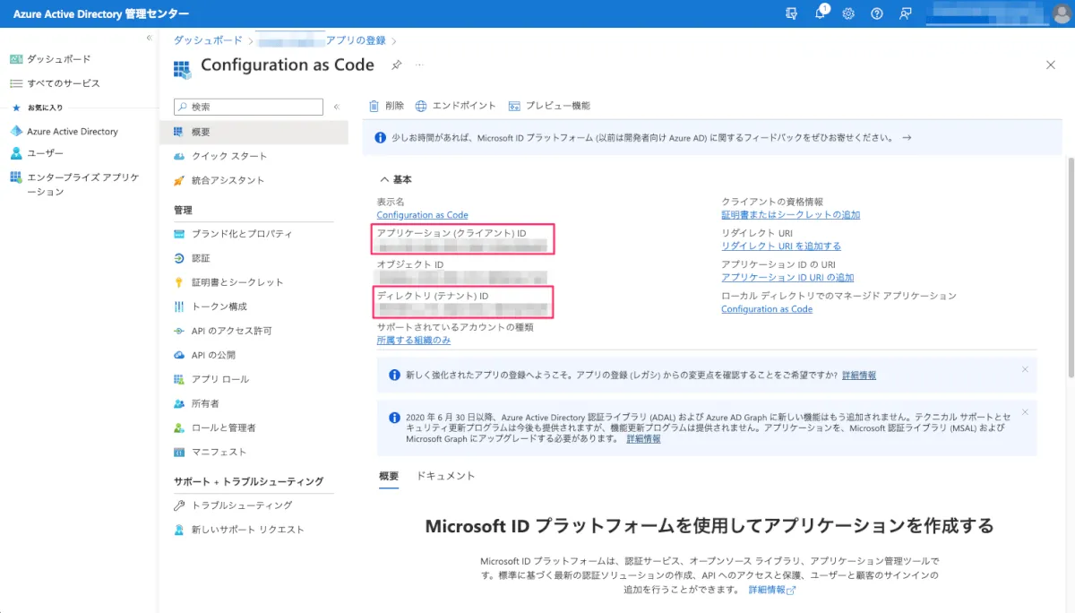 アプリの作成が完了すると「アプリケーション(クライアント)ID」が生成されるのでこれを控えておきます。ついでにAADのディレクトリ(テナント)IDも利用するためここで控えます。