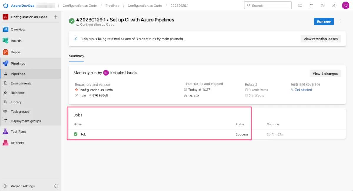 初回は設定した変数グループをパイプラインから利用することを承認するように要求されるので、「Permit」します。問題なければしばらくするとJobsがSuccessします。今回は1分40秒程度で完了しました。うまく行かない場合はエラーの内容が表示されるので、そこから切り分けを行いましょう。