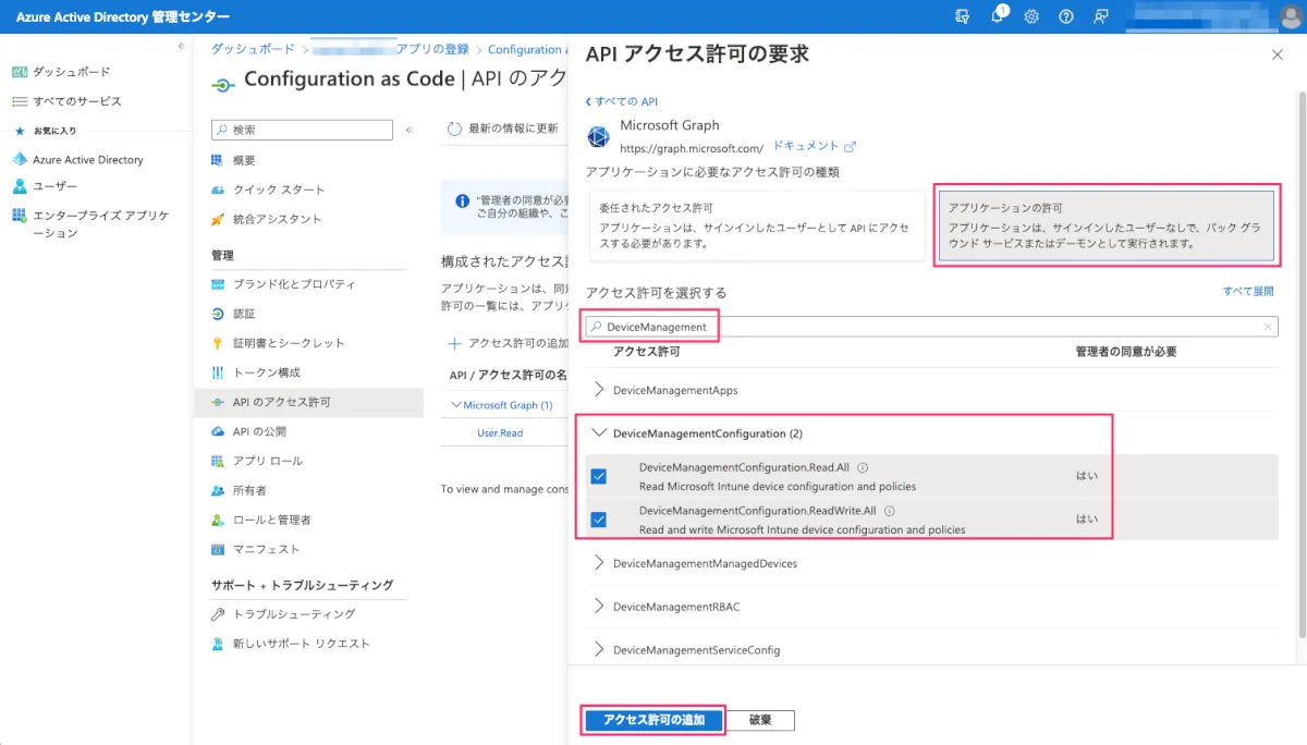 「アプリケーションの許可」を選択し、検索欄にDeviceManagementと入力すると「DeviceManagementConfiguration」の2つのアクセス許可が表示されるので、2つ共選択して「アクセス許可の追加」をします。