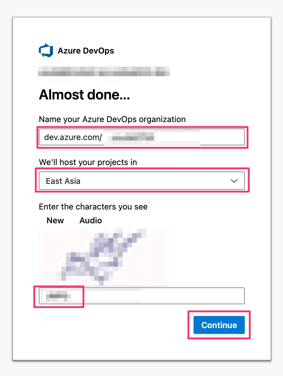 組織の名前とどこのホストを利用するかが聞かれるので適当に入力し、画面の指示に従って登録を進めます。