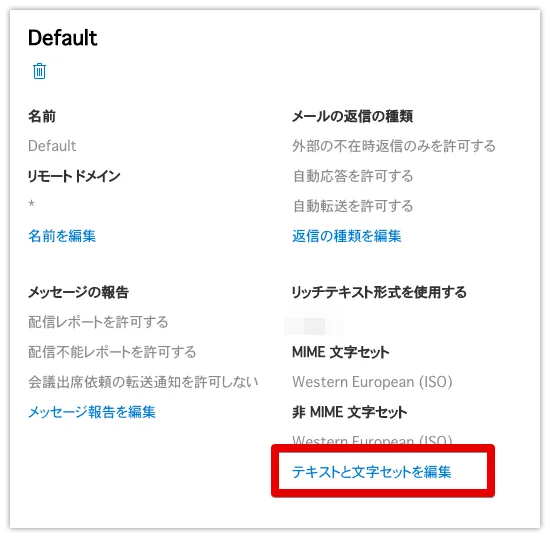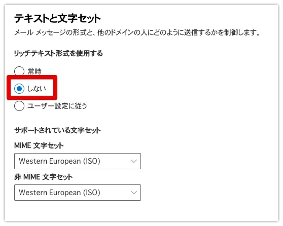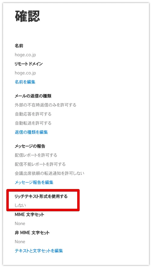また、ご自身のドメインにもリモートドメインの項目を追加し、それらのドメインにも「リッチテキスト形式」を「しない」に設定してください。