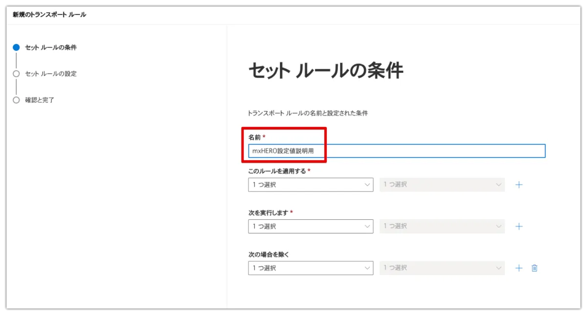 送信ルールから作成していきます。なお、ルール名の先頭か末尾に(送信)などと付けておくと後で識別が楽になります。