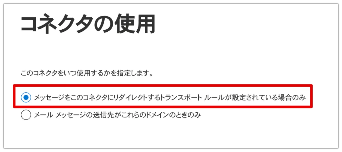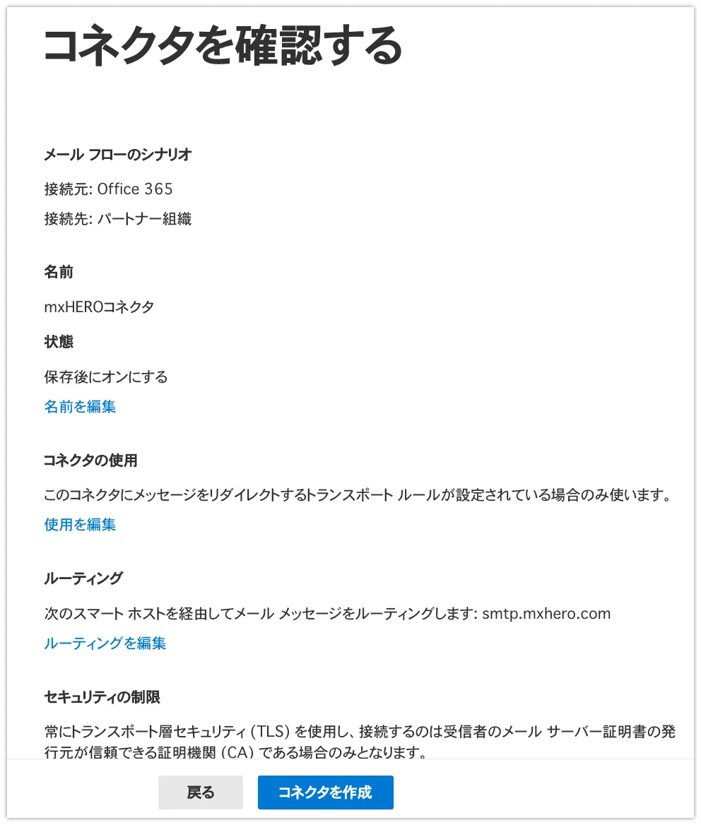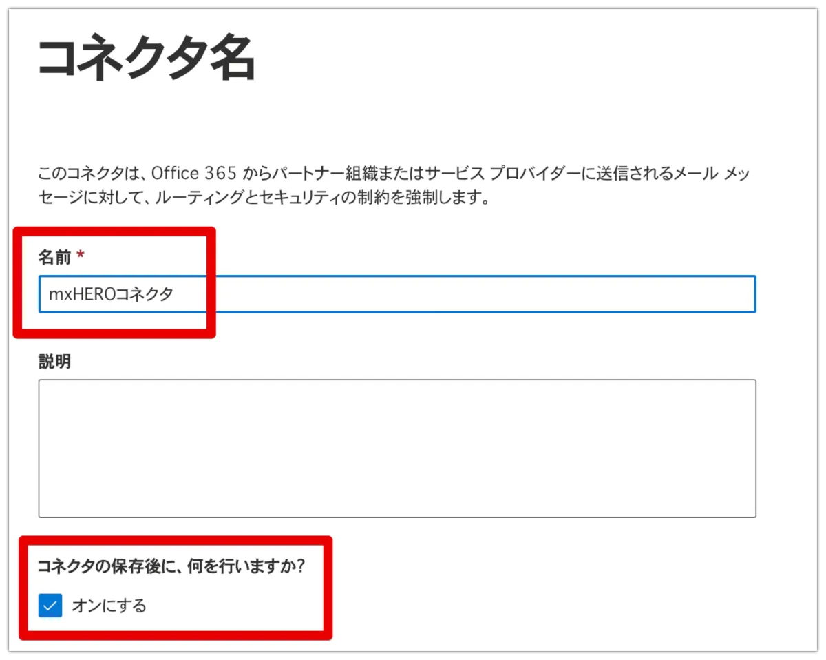 次にコネクタの名前をつけます。保存後にオンにする、のチェックを入れてください。なお、対応するルールが作成されていなければ、この段階でコネクタを有効にしてもメールの経路は変わりません。