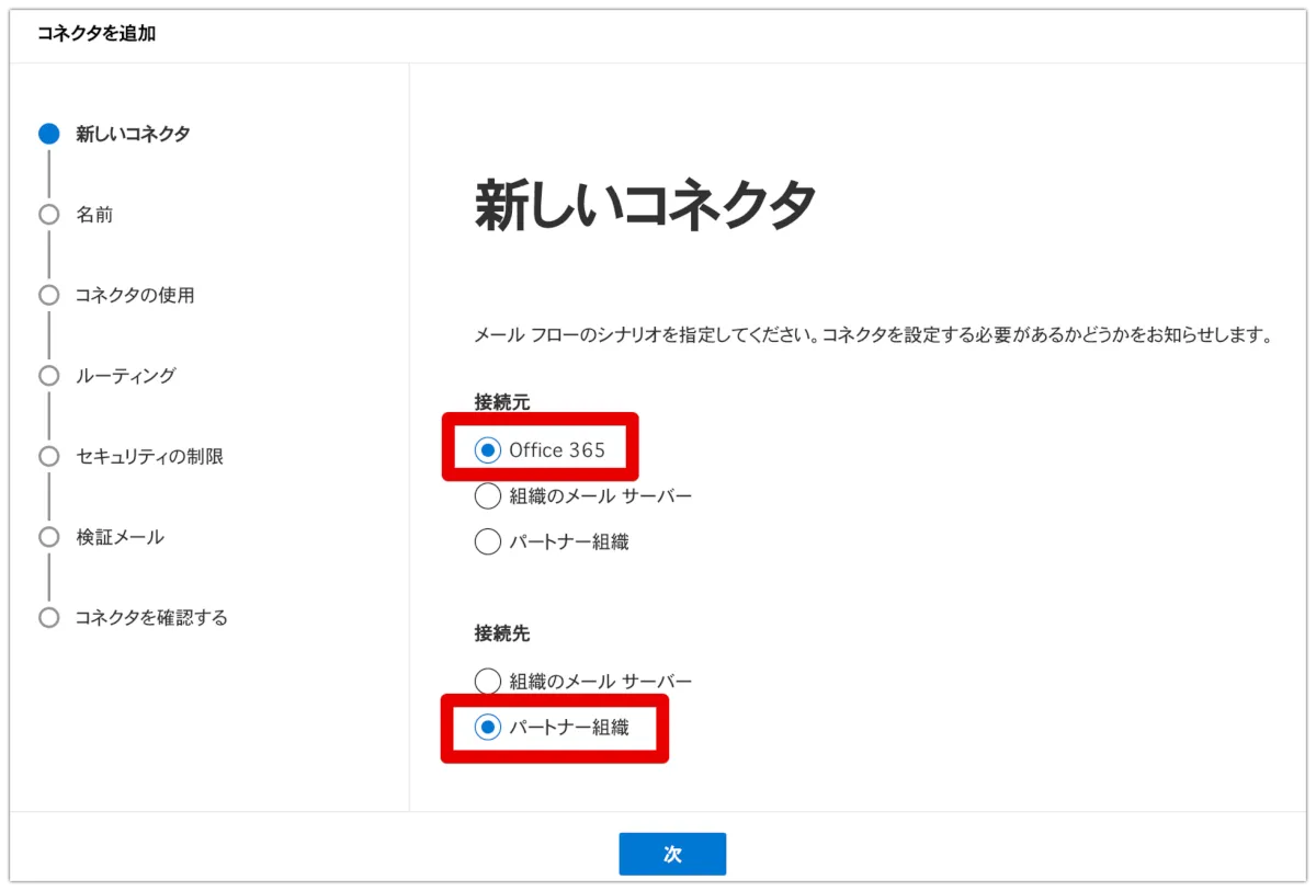 次にコネクタを作成します。ステップバイステップで進むので画面の遷移は多いですが、設定内容としてはあまり多くはありません。まず、接続元と接続先を指定します。