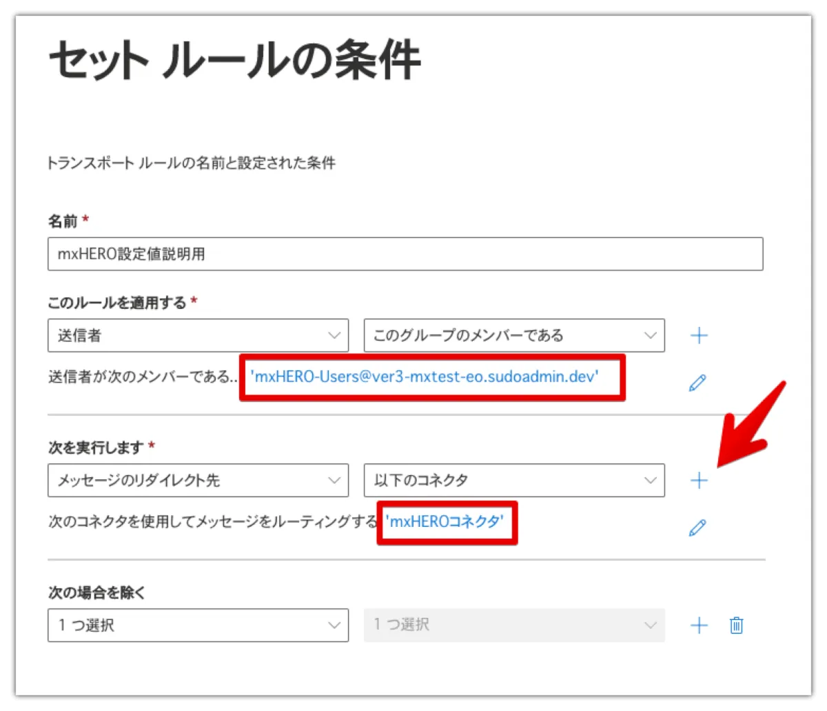 次に、”送信者”として、最初に作成したメールが有効なセキュリティグループを指定します。次に”メッセージのリダイレクト先”として先ほど作成したコネクタを指定します。その後”+”をクリックします。