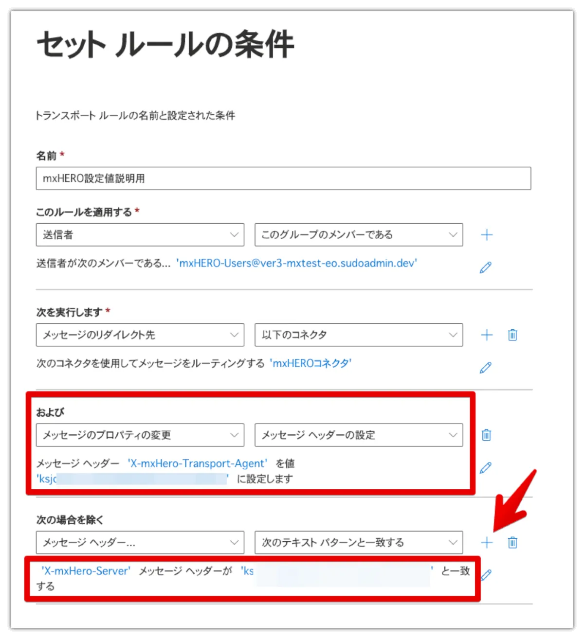 X-mxHero-Server値は同様に、最初に取得した、TransportAgentの値を設定します。ここまで終わったら、また、”+”をクリックします。