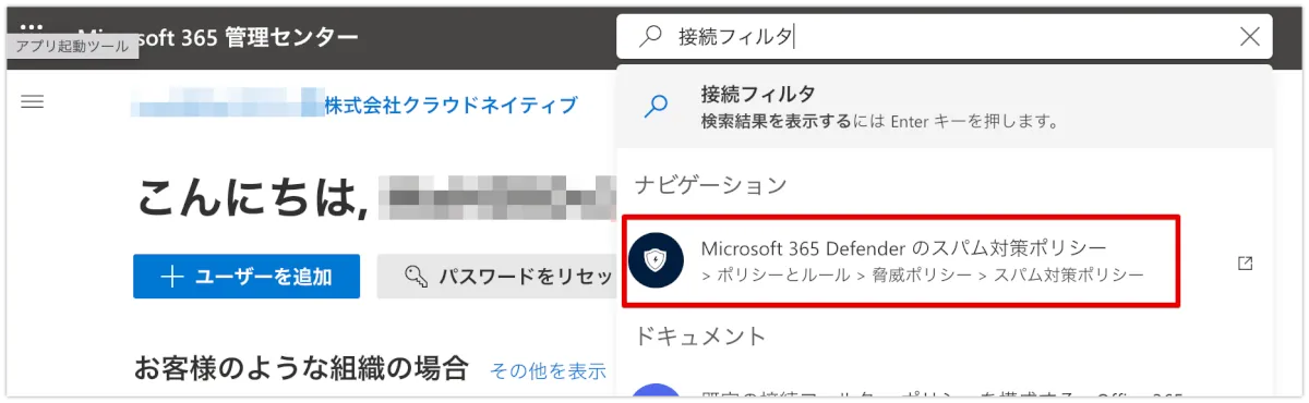 次に接続フィルタを設定しますが、場所が変更になっています。以下のようにMicrosoft365管理センターの検索から飛ぶのが迷いませんのでそちらをお勧めします。