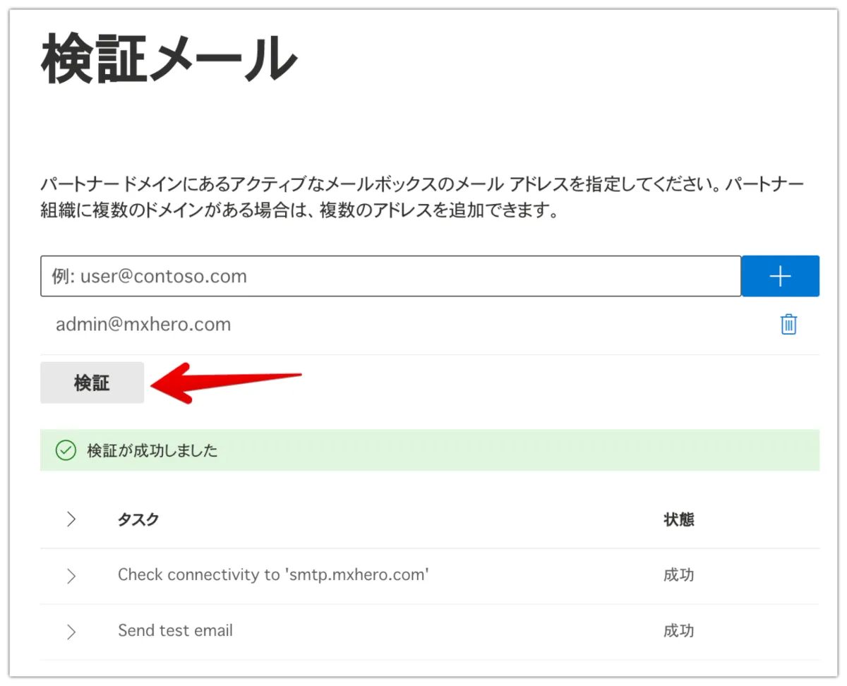 admin@mxhero.com宛先を入力したら、”検証”をクリックします。