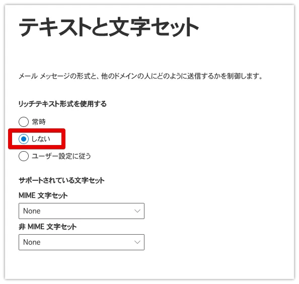 ドメイン構成で問題となるのは、「リッチテキスト形式」です。デフォルト」を「しない」に設定してください。