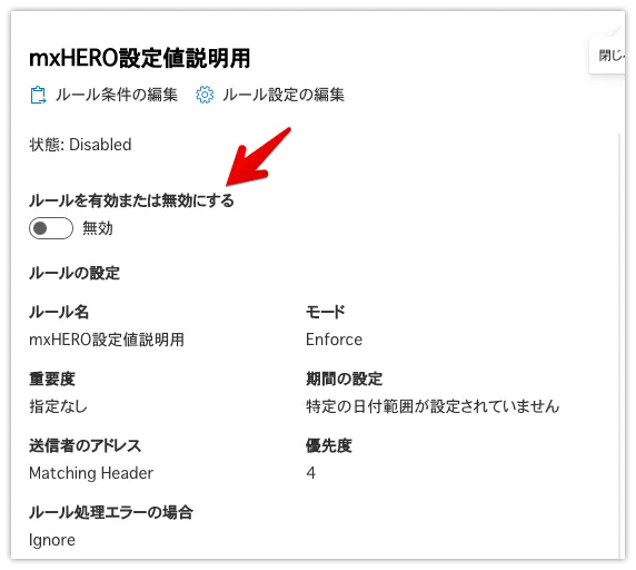 内容を確認して問題なければ保存します。最後にルールをオンにすることで経路が変わります。自動的にオンにはなりませんので注意してください。