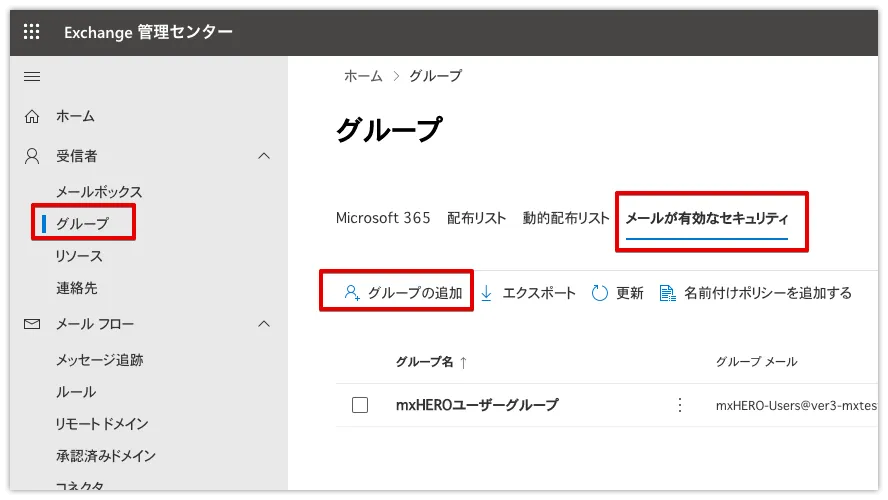 それでははじめていきます。まず、メールが有効なセキュリティグループを作成し、mxHeroのルールの適用対象とするユーザーをグループに追加します。