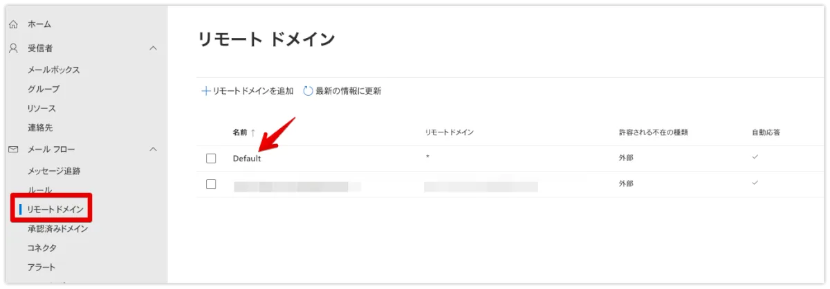 左メニューの「メールフロー」をクリックし、上部のタブにある「リモートドメイン」をクリックしてください。