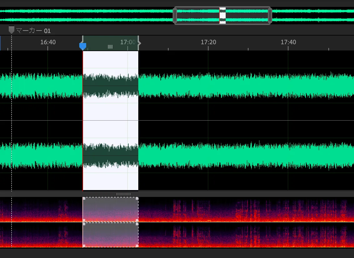 なぜトンネル内をマークしていくのかというと、トンネル内とトンネル外のノイズの種類が異なるためです。その空間のノイズプリントをキャプチャしてノイズリダクションしてあげることで、より綺麗にノイズを削除することができます。